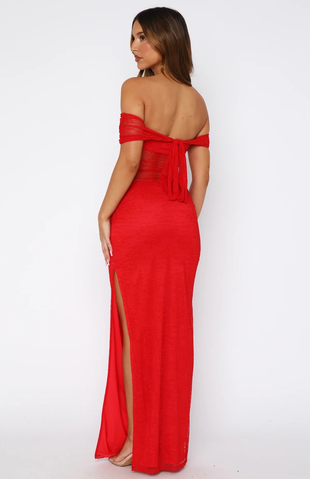 Spice things up in our Matcha Baby Off Shoulder Maxi Dress Chilli Red! Features an off‑the‑shoulder neckline and delicately ruched bodice. The fitted, lined bust transitions into a sheer lace panel at the waist, creating a subtly sultry contrast, while the flowing maxi skirt is cut with a leg split for just the right amount of drama. Adjustable straps at the back ensure a flawless fit. Continue the statement by styling with kitten heels and gold accents.