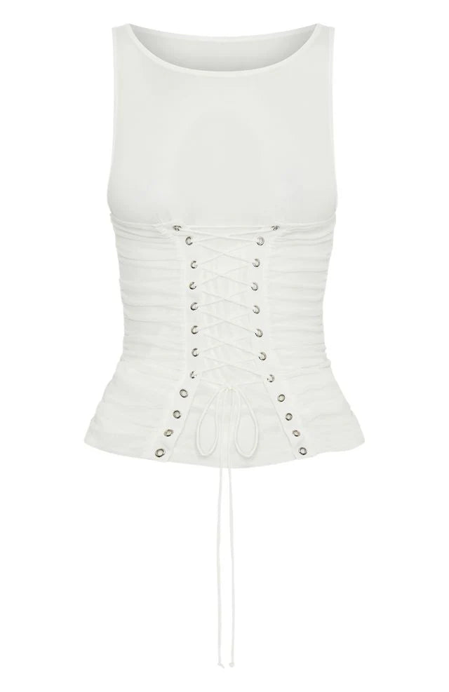 The Midnight Drive Top Off White is the perfect desert coded fit! Features a high cut neckline with thick shoulder straps and sheer mesh material, cropped length, centre front lace up design and stretch material for an easy slip on design. Slay your look with the The Old Days Pleated Mini Skirt White and a chunky belt.