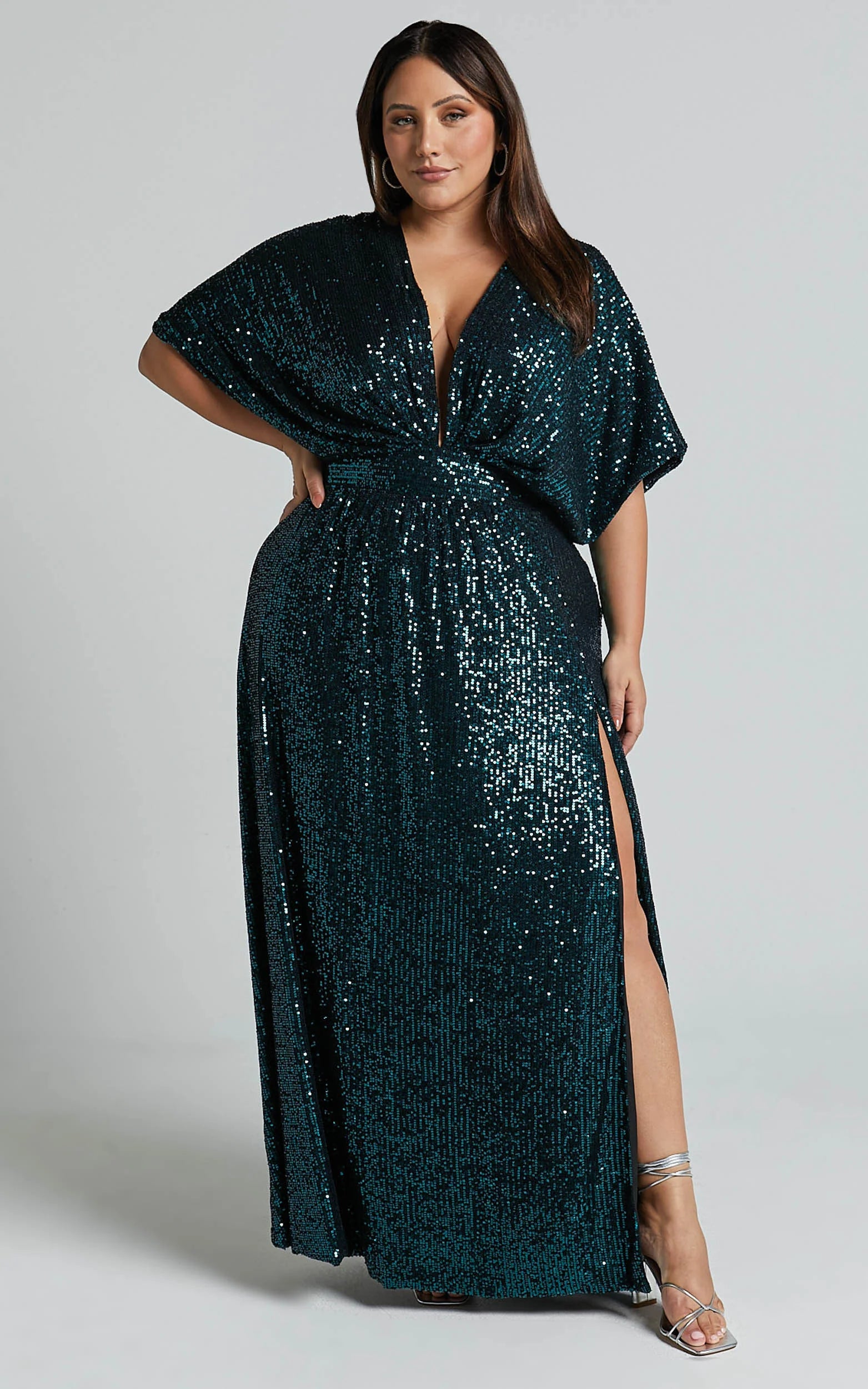The Miyah Maxi Dress in Emerald brings full-glam impact with a plunging neckline, short sleeves, and a sweeping silhouette made for weddings, formals, and big nights out. The sparkly sequin finish catches every light, while the rich emerald hue flatters every skin tone, bold, confident, and totally unforgettable. Style the Miyah with minimalist heels and simple jewellery to let the shimmer speak for itself, or add a sleek clutch for an elevated finish. If you want a playful twist, go for metallic accents or statement earrings for extra sparkle. A true scene-stealer, this is the dress you wear when you want maximum wow with minimal effort.