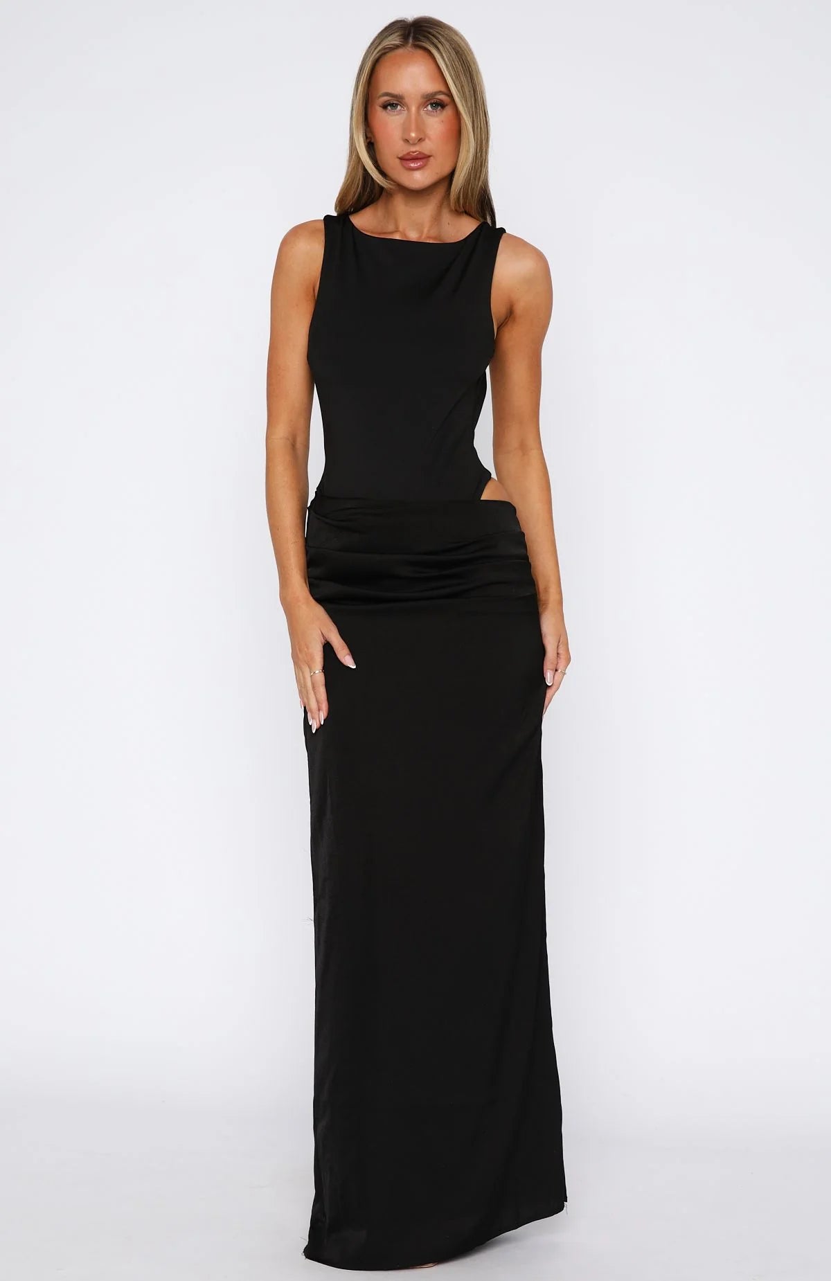 The aesthetic is glam! The Moonlight Muse Maxi Dress Black features a high cut neckline with adjustable, back self tie strap, cut out design at hip, ruched detailing, side zipper and clasp closure on skirt, high side split detailing and maxi length. Add layered jewellery for a night worth celebrating!
