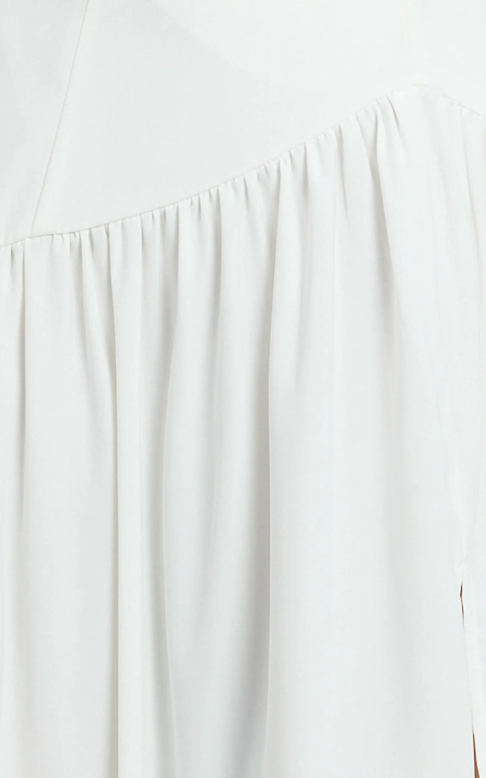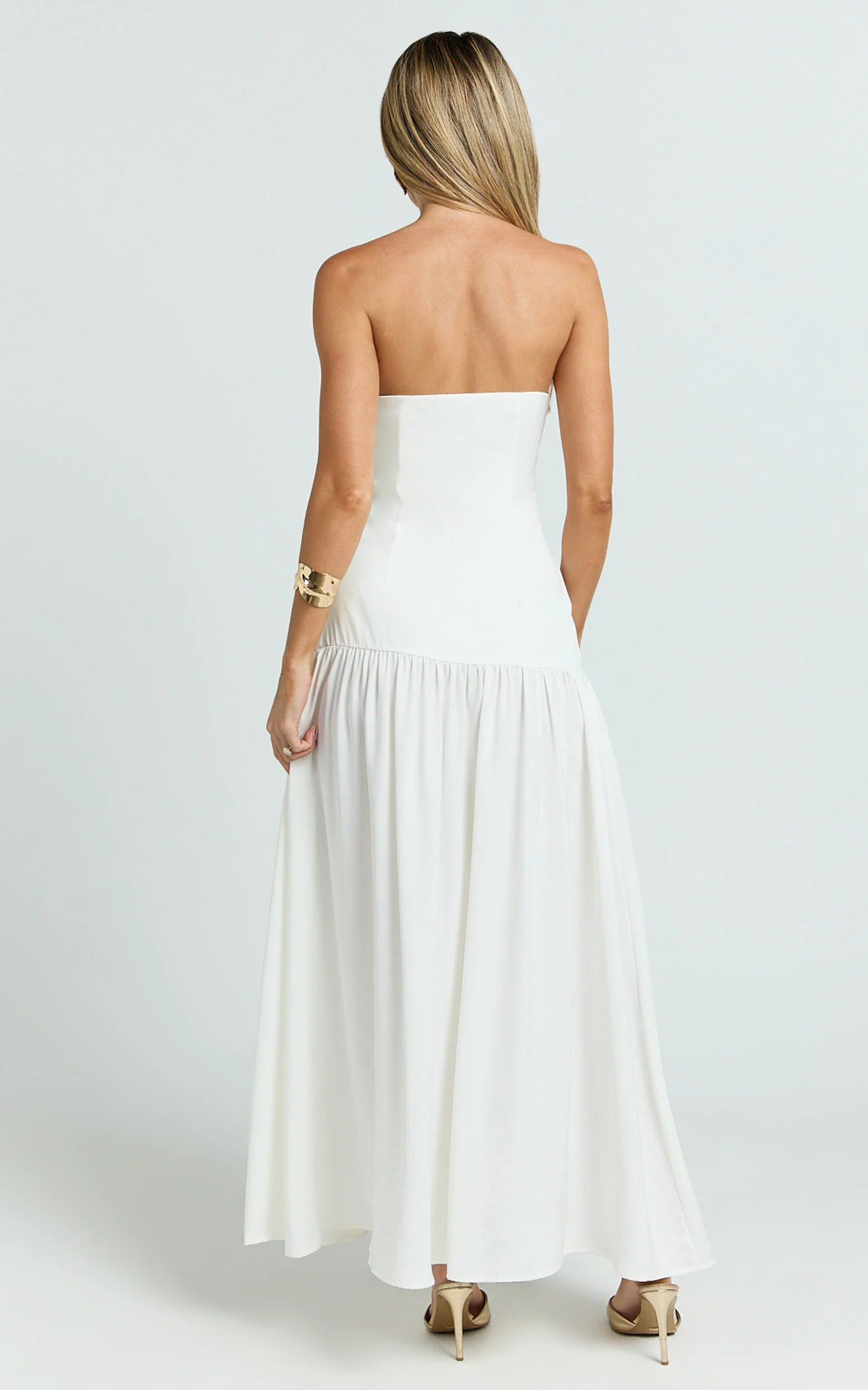 This asymmetric drop waist and fluid maxi silhouette create that elongated, sculpted vibe, while the clean white hue feels fresh and luxe. Subtle drama comes through the angled hem and sleek neckline, perfect for embracing Bowcore energy with a modern twist. Add a hint of Pump Up the Volume with statement earrings and a swept-back updo to let the look speak for itself.