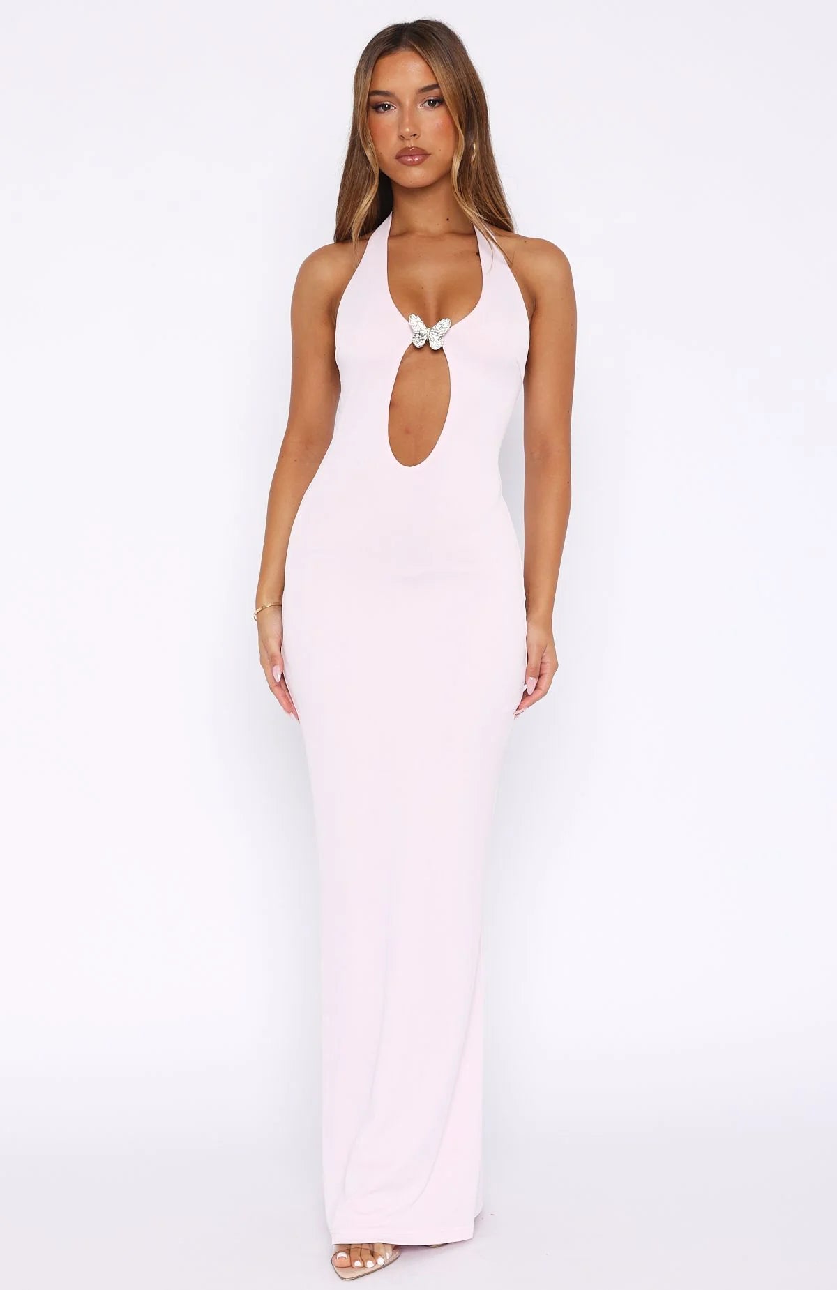 The Never Be Friends Maxi Dress Baby Pink has been waiting for you...Featuring a halter neck design with hook and loop closure, low plunge neckline, front cut out detailing with silver hardware butterfly design, maxi length, stretch material, and backless.