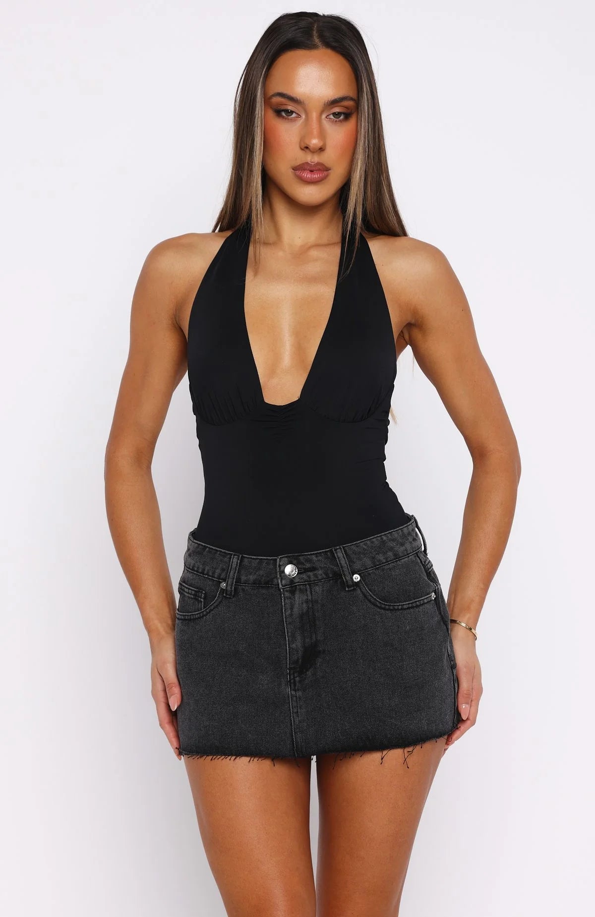 Flirty, fitted, and fabulous! The New Horizons Halter Bodysuit in Black features thick self-tie halter straps and a plunging neckline, complemented by an under-bust seam and ruched detailing at the center front. Its fitted silhouette and snap button closure ensure a sleek, flattering fit, while the fully lined design offers comfort and support. Style with your go-to denim jeans, kitten heels and layered gold jewellery for an understated but elegant fit.