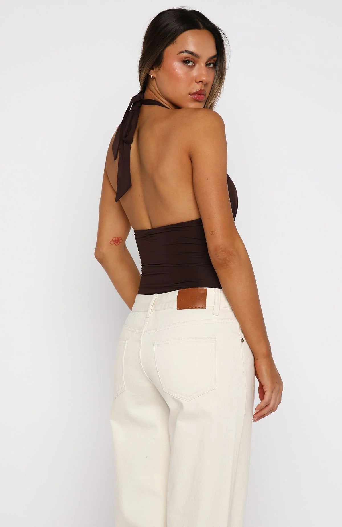 Flirty, fitted, and fabulous! The New Horizons Halter Bodysuit in Espresso features thick self-tie halter straps and a plunging neckline, complemented by an under-bust seam and ruched detailing at the center front. Its fitted silhouette and snap button closure ensure a sleek, flattering fit, while the fully lined design offers comfort and support. Style with your go-to denim jeans, kitten heels and layered gold jewellery for an understated but elegant fit.