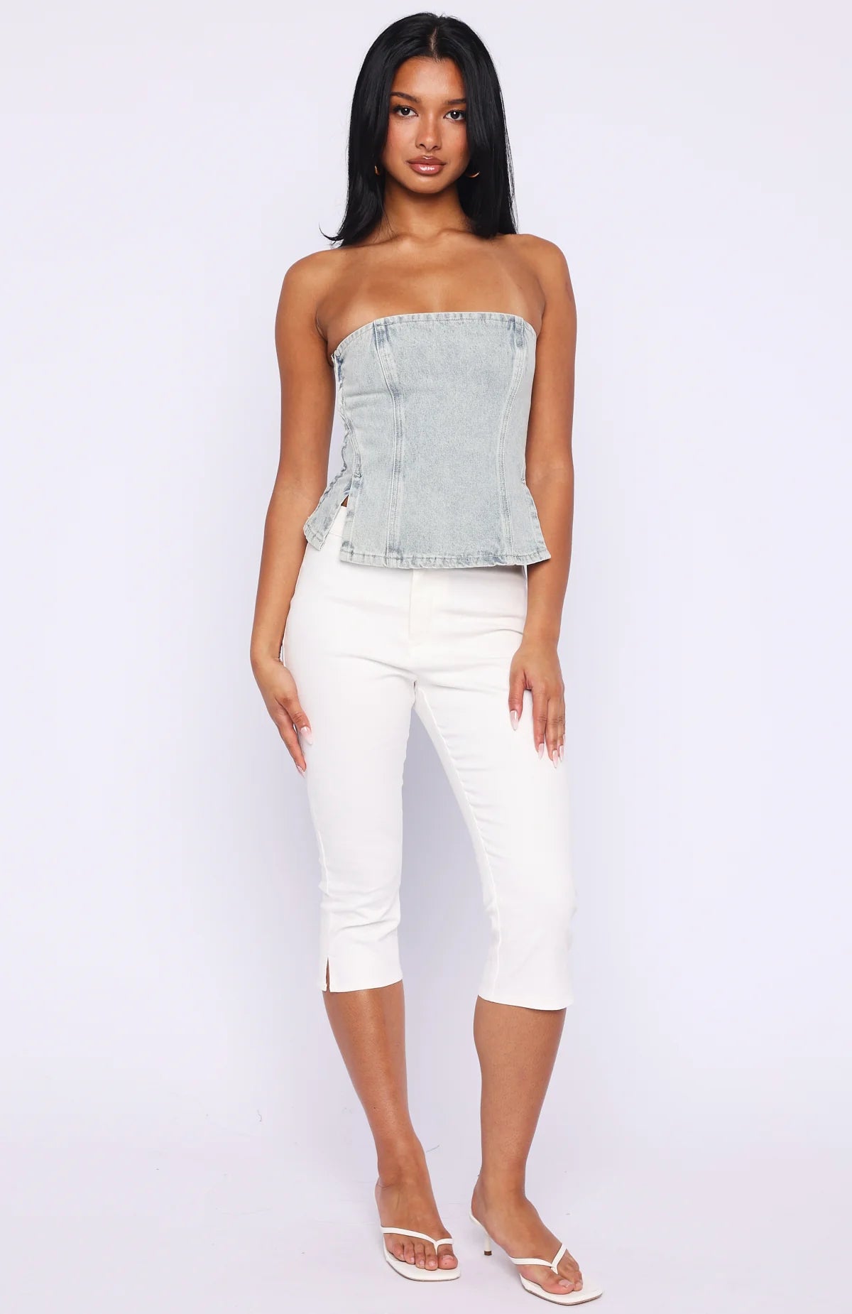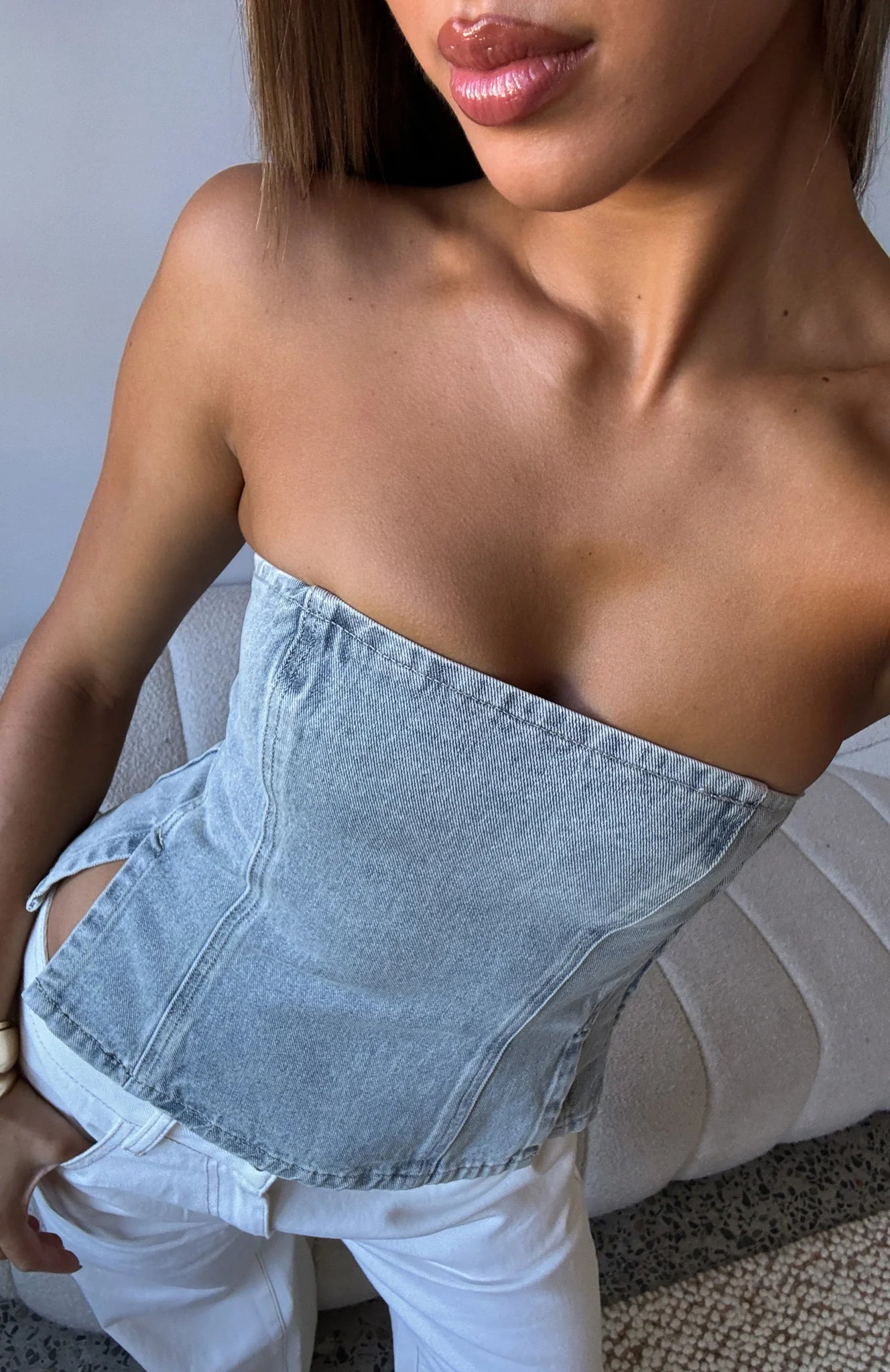 The Not Listening Strapless Denim Top in Light Blue redefines a wardrobe classic with an effortlessly cool silhouette! Features a strapless neckline and a sleek, fitted silhouette that flatters your figure. A subtle hem-split and side zipper add a modern edge and easy wearability. Style it with capris, kitten heels, and layered gold jewellery for an effortlessly chic look.