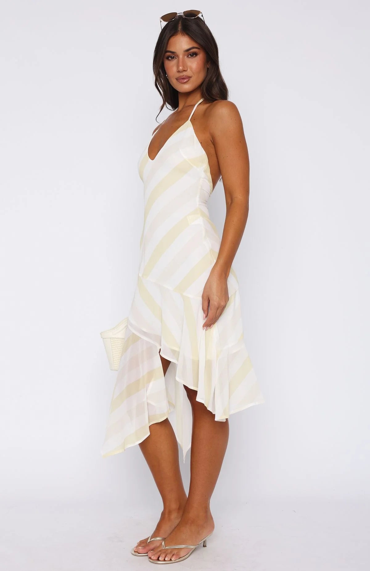 Turn heads this Grand Slam in the On His Mind Midi Dress in Citrus Stripe! Features spaghetti self tie halter straps, v-neckline, feminine asymmetrical skirt design, backless, invisible zipper with hook and eye closure centre back and lined. Complete the look with kitten heels and sunnies for the perfect summers day fit!