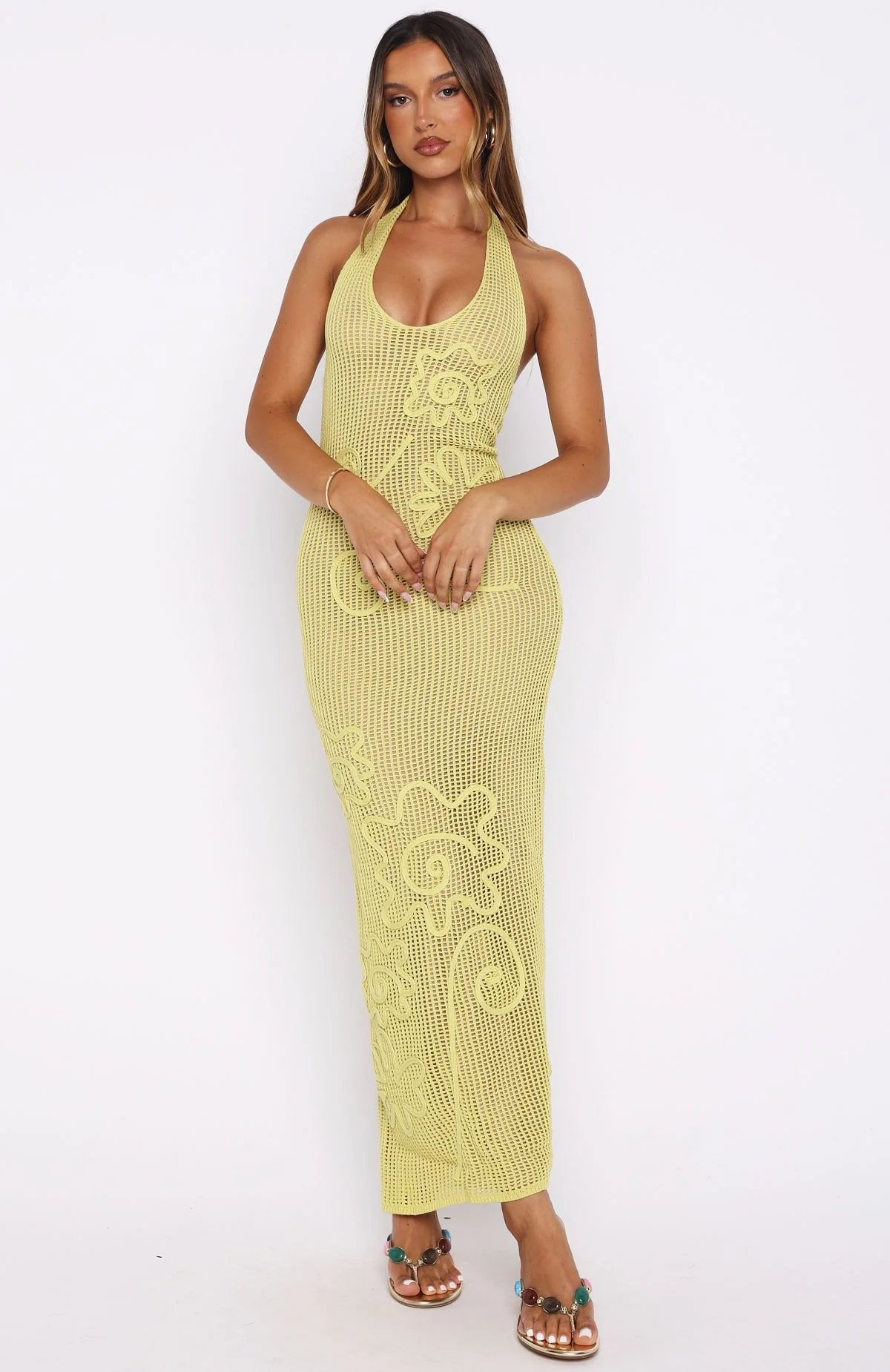 Happier in the Only You Knit Maxi Dress in Citrus! Designed with thin self‑tie halter straps, a scoop neckline, relaxed knit silhouette with a floral design, mesh lining and a slip‑on style. Pair with simple heels and layered gold jewellery to let the dress have it's moment.