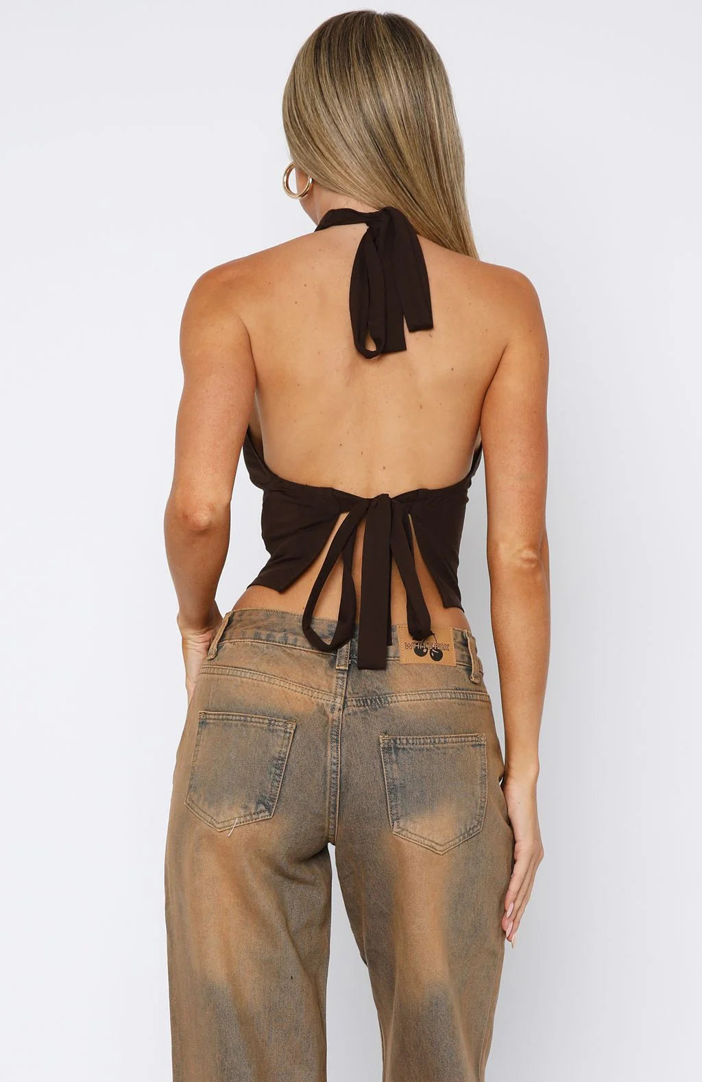 Obsession alert: Halter Tops. The Our Little Secret Top in Chocolate features an adjustable halter neck style, high neckline, unlined, backless, cropped length and adjustable back tie detailing. Style with a low rise pant and your favourite gold accessories!