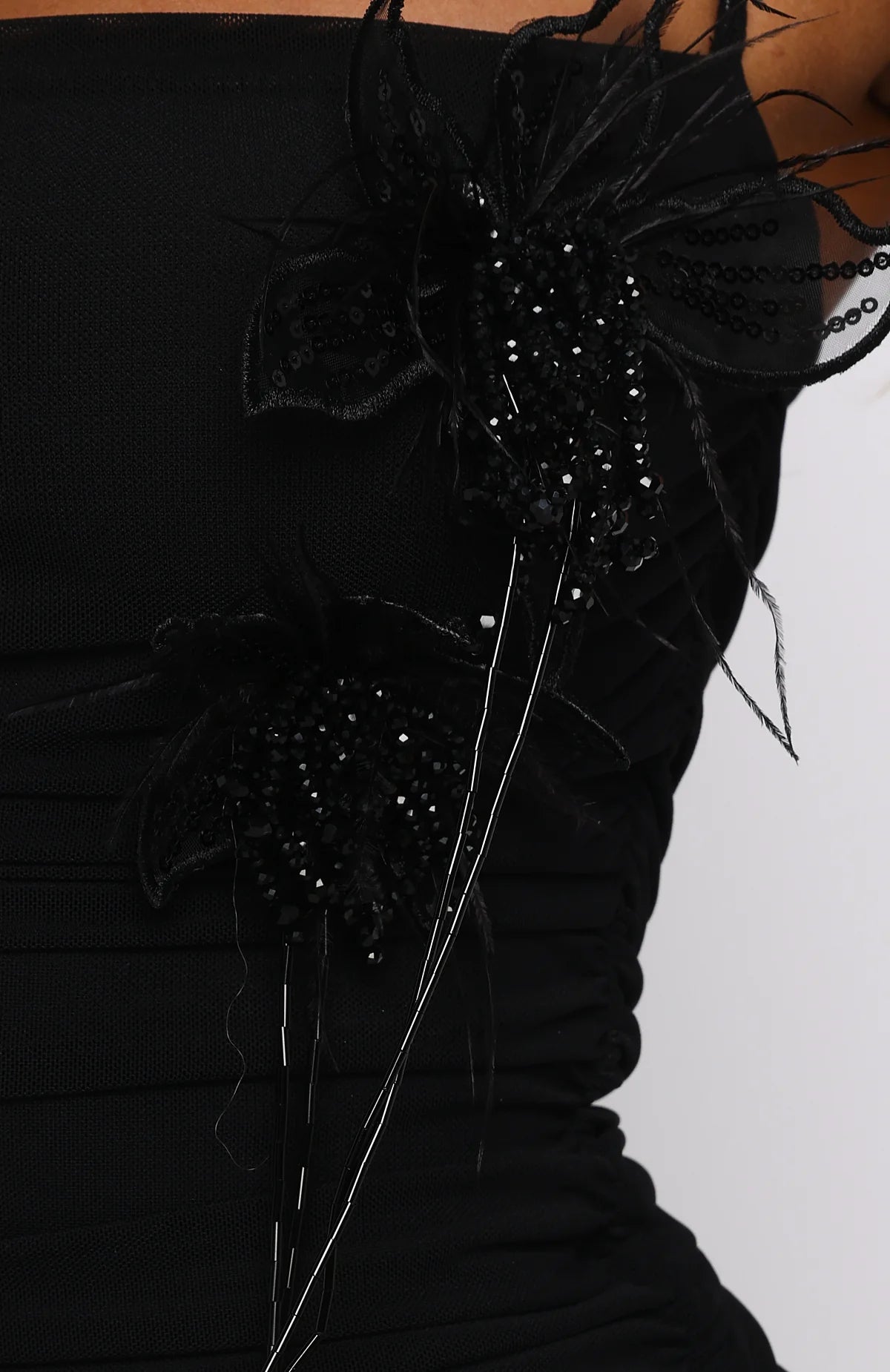 Weekend plans? This outfit’s already RSVP’d. The Over Drive Mini Dress Black features a halter style design with self-tie straps, square neckline, side ruched detailing at the bodice, figure-hugging fit, mini length, lined material, flower embellishments and stretch material for an easy slip-on design. Pair with black heels and a slick back for a look we love!