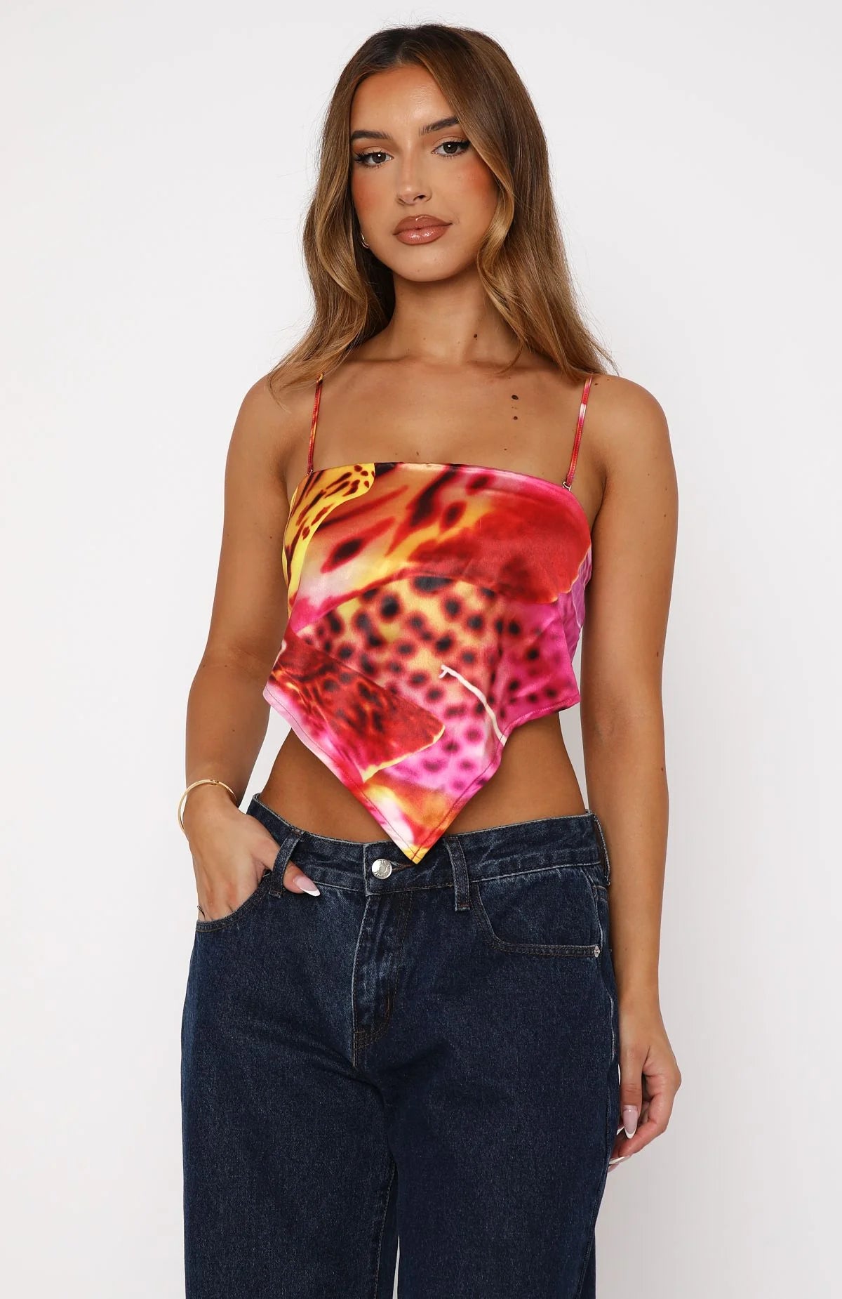 Make sure to pack the Paradise Island Top Orchid Sun for your next summer vacation! Featuring thin, adjustable shoulder straps that are detachable, backless with self tie strap, internal bra shelf, cropped length and gorgeous printed fabric. Style over a bikini top and denim skirt for an easy, but cute beach fit!