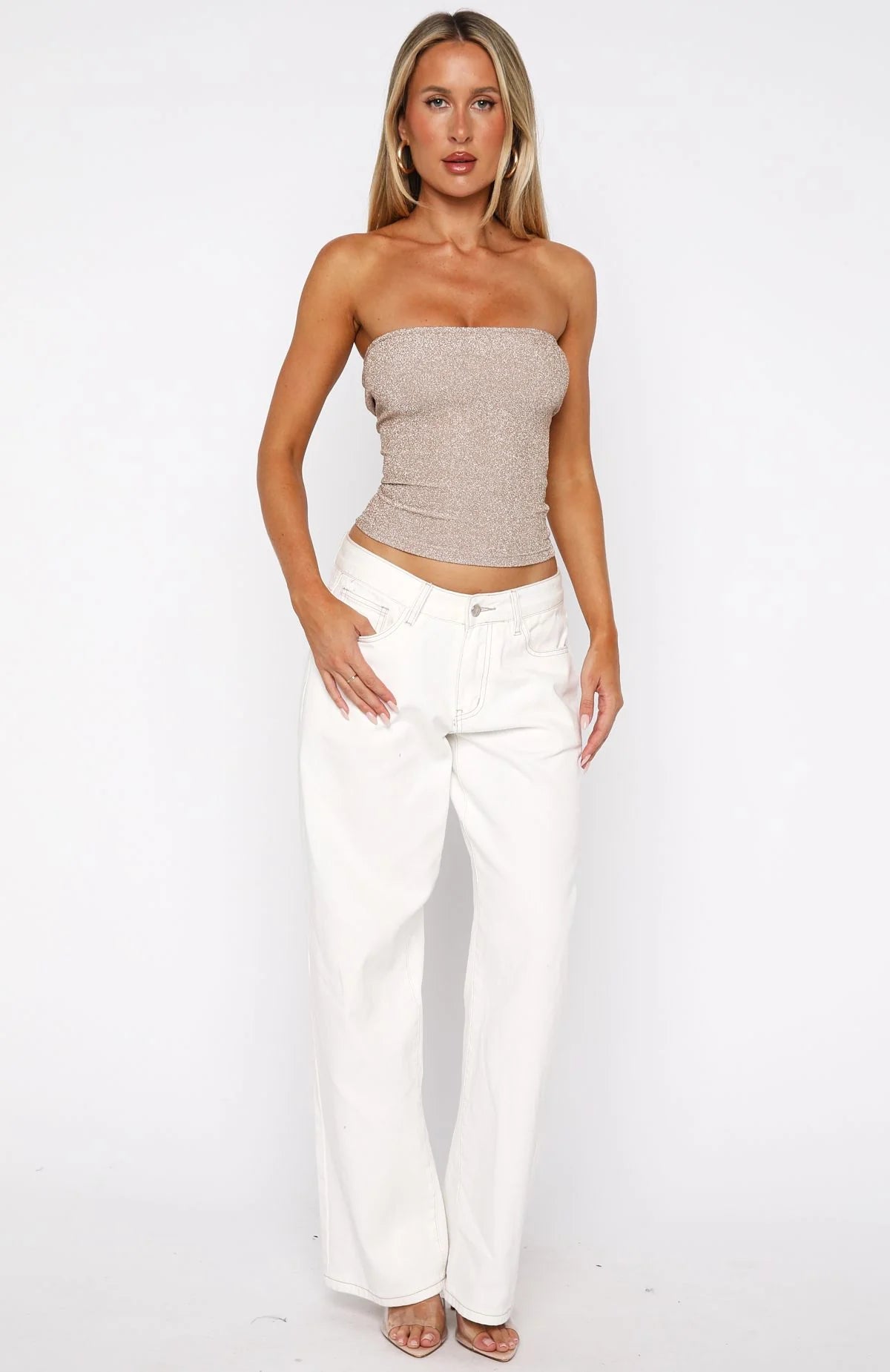 Slip into effortless glamour with the Passing By You Strapless Top Champagne! The elasticated bust keeps everything secure while you move, and the stretch fabric hugs you in all the right places! Embellished with glitter, this champagne beauty catches the light from every direction. Perfect for nights when you want to sparkle without the fuss. Simple to style, impossible to ignore.