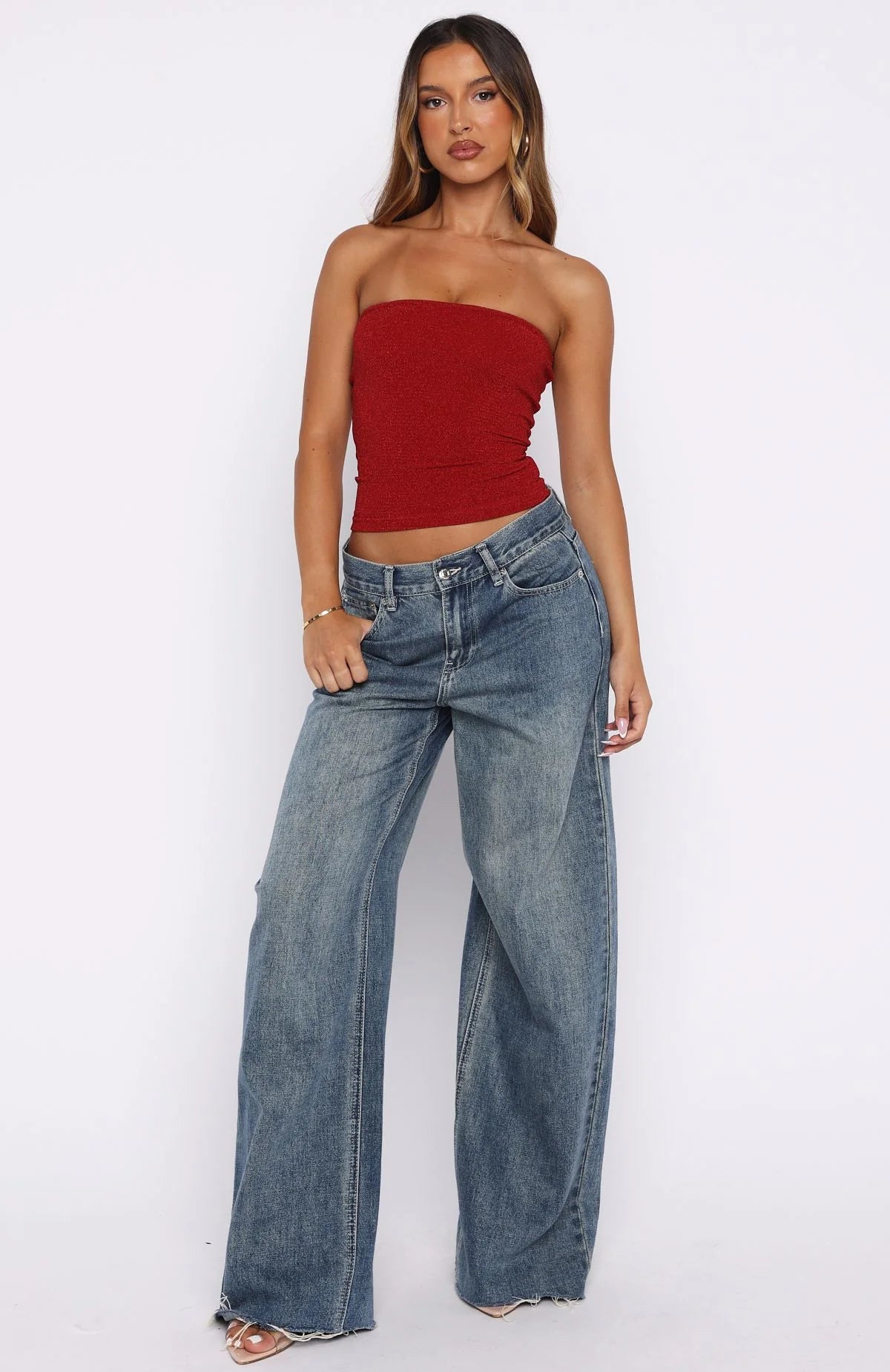 Slip into effortless glamour with the Passing By You Strapless Top Red! The elasticated bust keeps everything secure while you move, and the stretch fabric hugs you in all the right places! Embellished with glitter, this champagne beauty catches the light from every direction. Perfect for nights when you want to sparkle without the fuss. Simple to style, impossible to ignore.