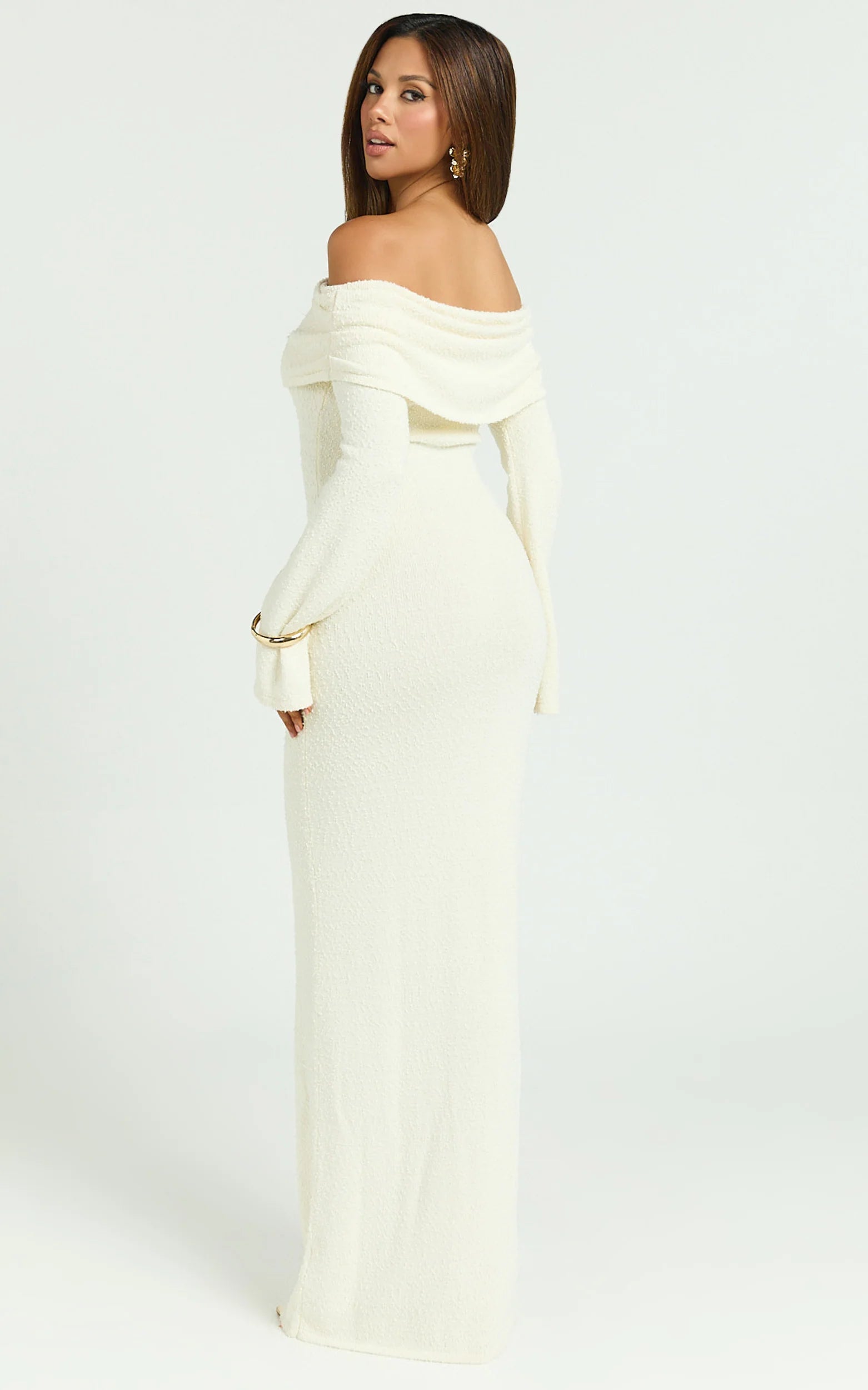 This dreamy cream off-shoulder maxi flawlessly blends vintage-inspired charm with modern sophistication, featuring a figure-skimming silhouette and chic knit texture that flatters your curves in all the right ways. Whether you're heading out to brunch or dancing under the stars, its versatile style makes looking your best feel easy and natural.