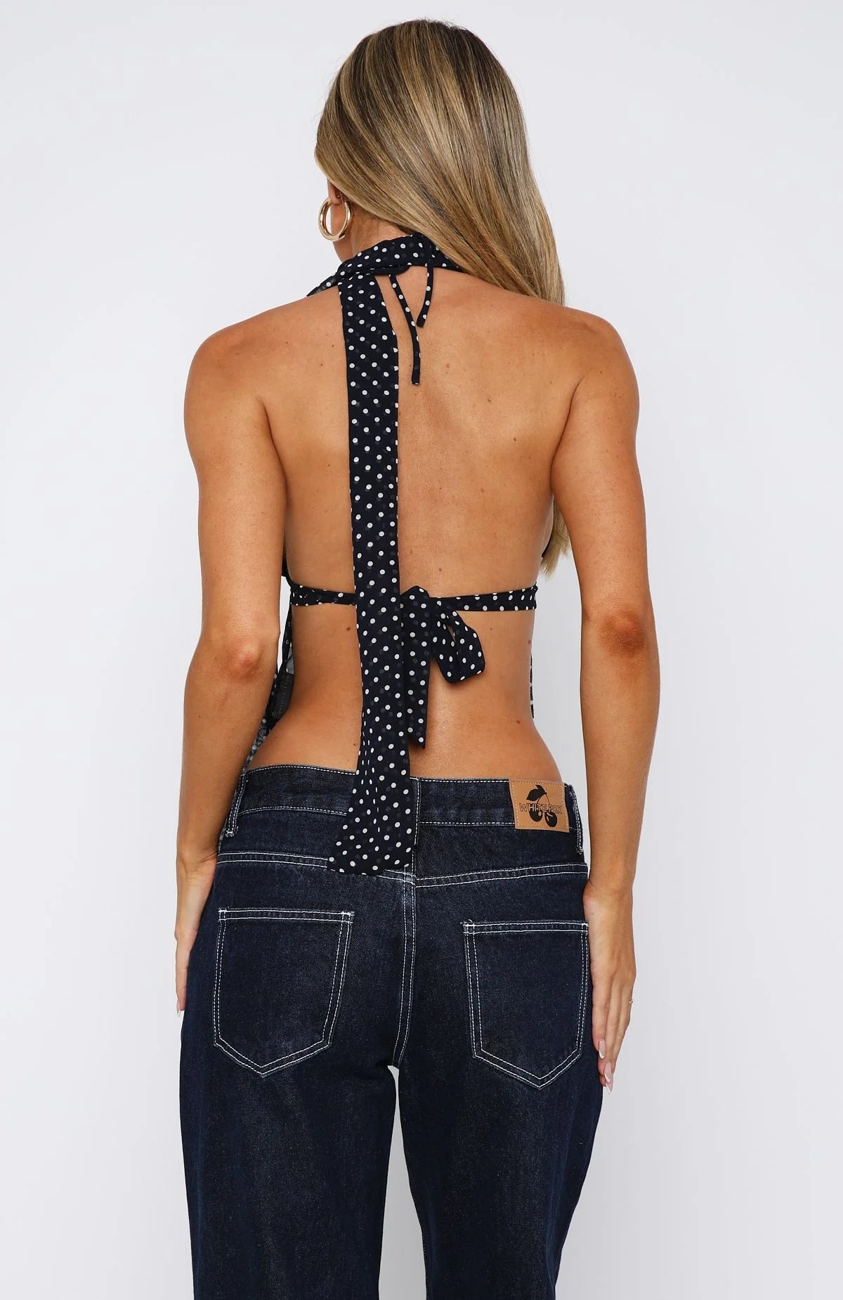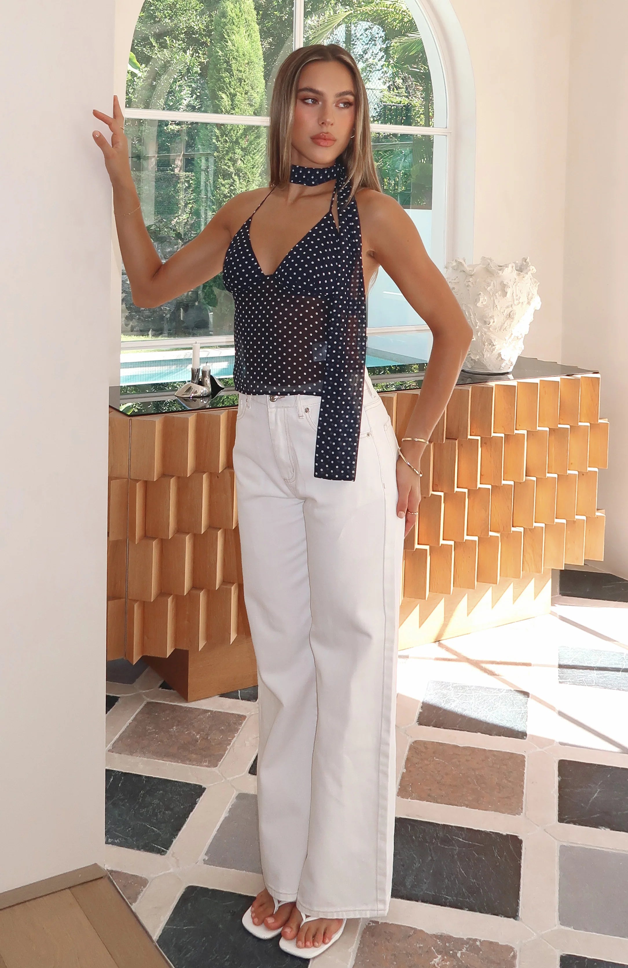The Quick Getaway Top in Navy Polka Dot is the ultimate cool girl top! Features halter neckline with self tie straps, self tie straps centre back for support, backless and separate scarf to elevate the look. Complete the look with your favourite White Fox jean and heels for a fit we are obsessed with!
