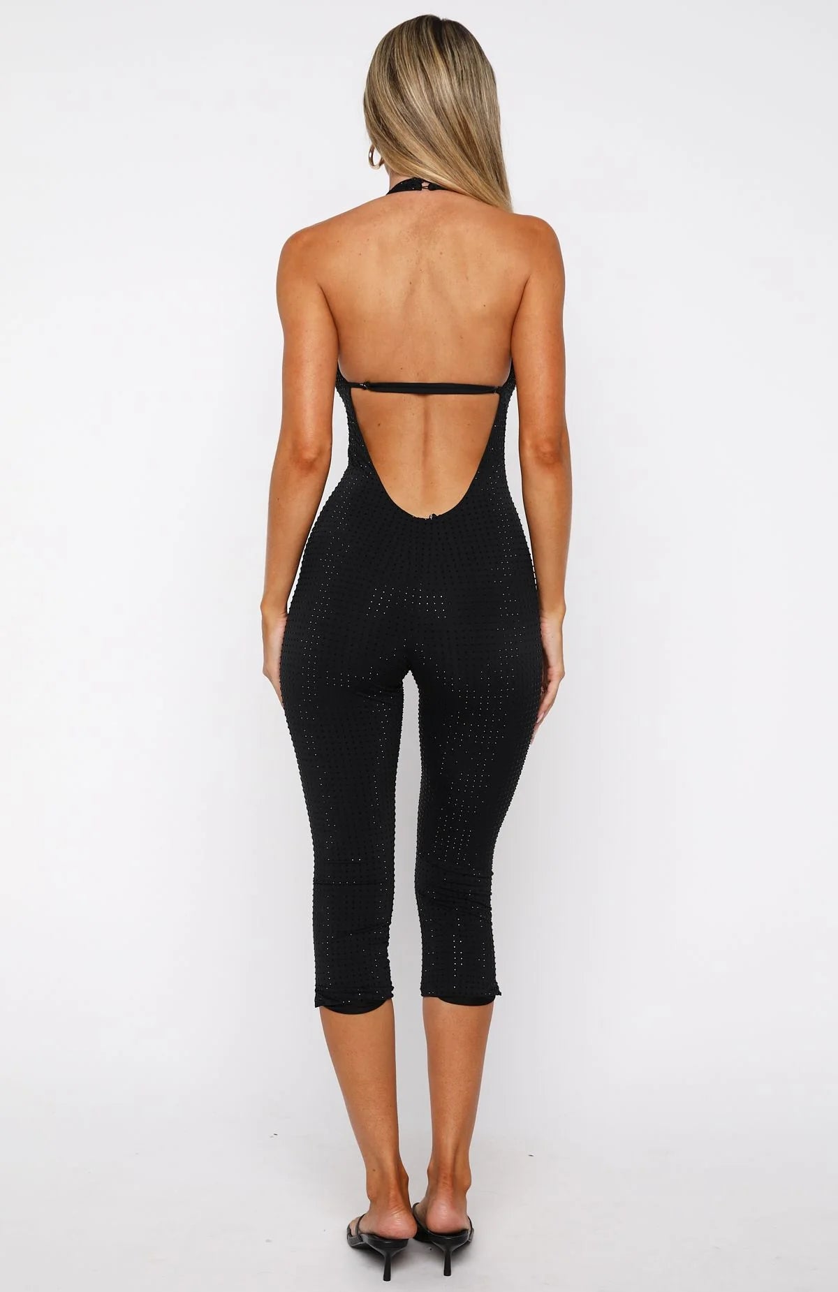 One for the outfit diary! The Retrograde Romance Embellished Jumpsuit in Black features a halter strap with a button closure at the nape, a soft scoop neckline, and a figure‑hugging silhouette. Capri‑length trousers meet a bold backless cut with an adjustable strap, while full lining, sparkling diamante embellishments, and stretchy fabric complete this standout look. Slide into clear heels and stack delicate gold necklaces and rings for a Paris night that glows just as bright as the city lights.
