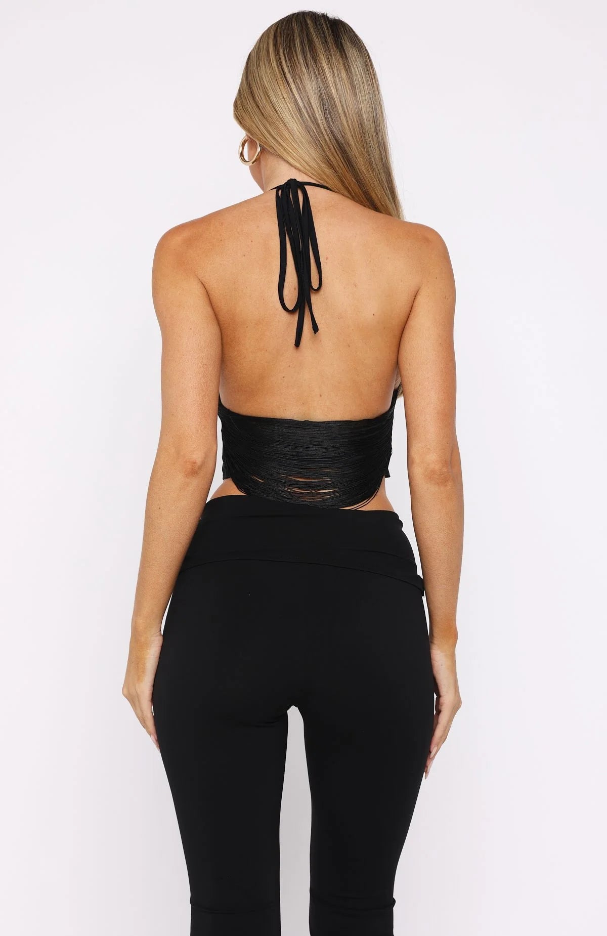 Why not, when on a girls night out? The Roller Queen Halter Top in Black features self‑tie halter straps, a draped cowl neckline, playful fringe detail, and a sheer mesh panel at the sides. Fully lined and backless, it blends bold glamour with flirtatious allure. Style with your go-to denim jeans and layered with a coat for colder days.