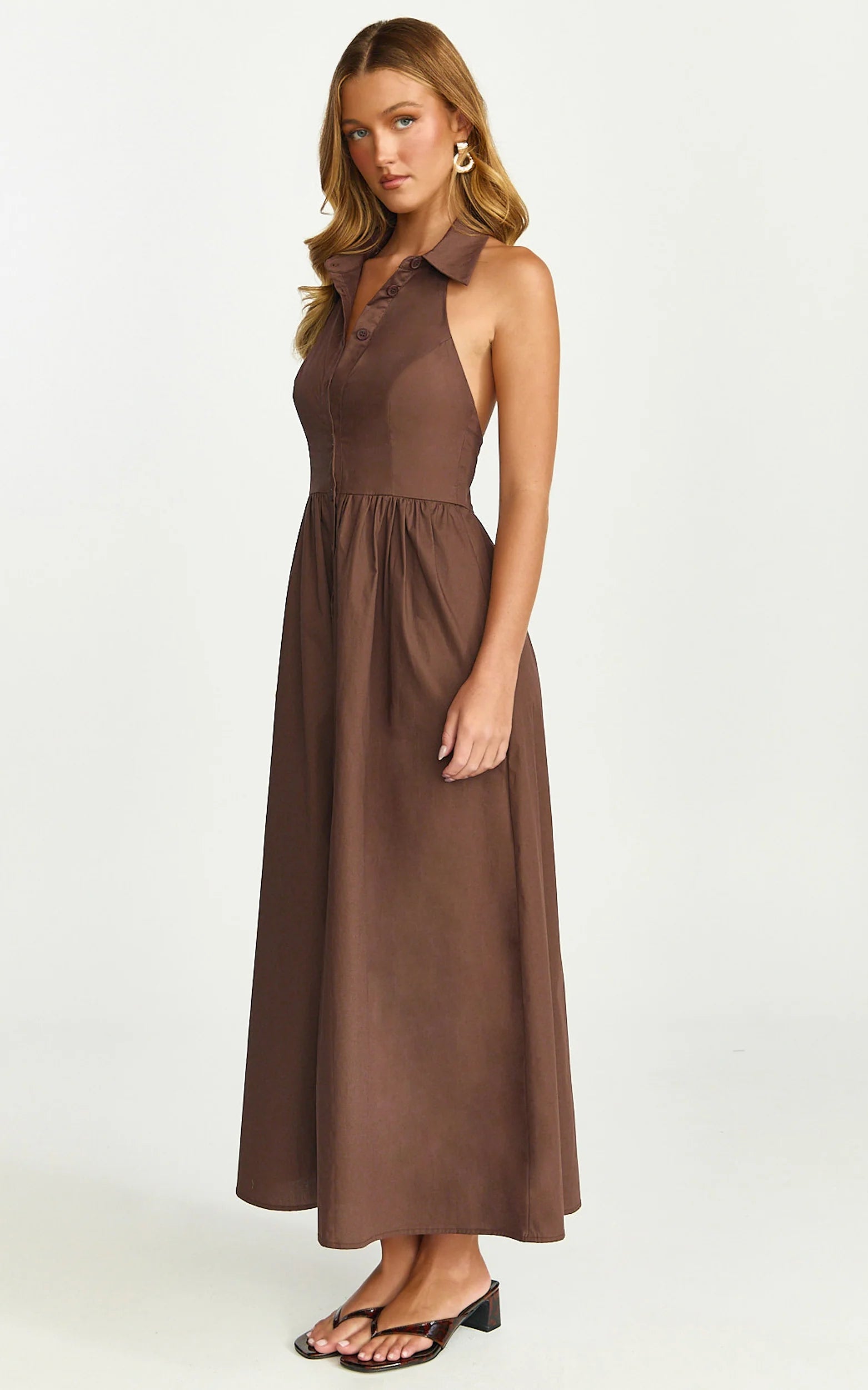 This collared, button-down midi cinches the waist with soft gathering, then flares into a swishy skirt for an effortless, flattering fit in rich dark chocolate.