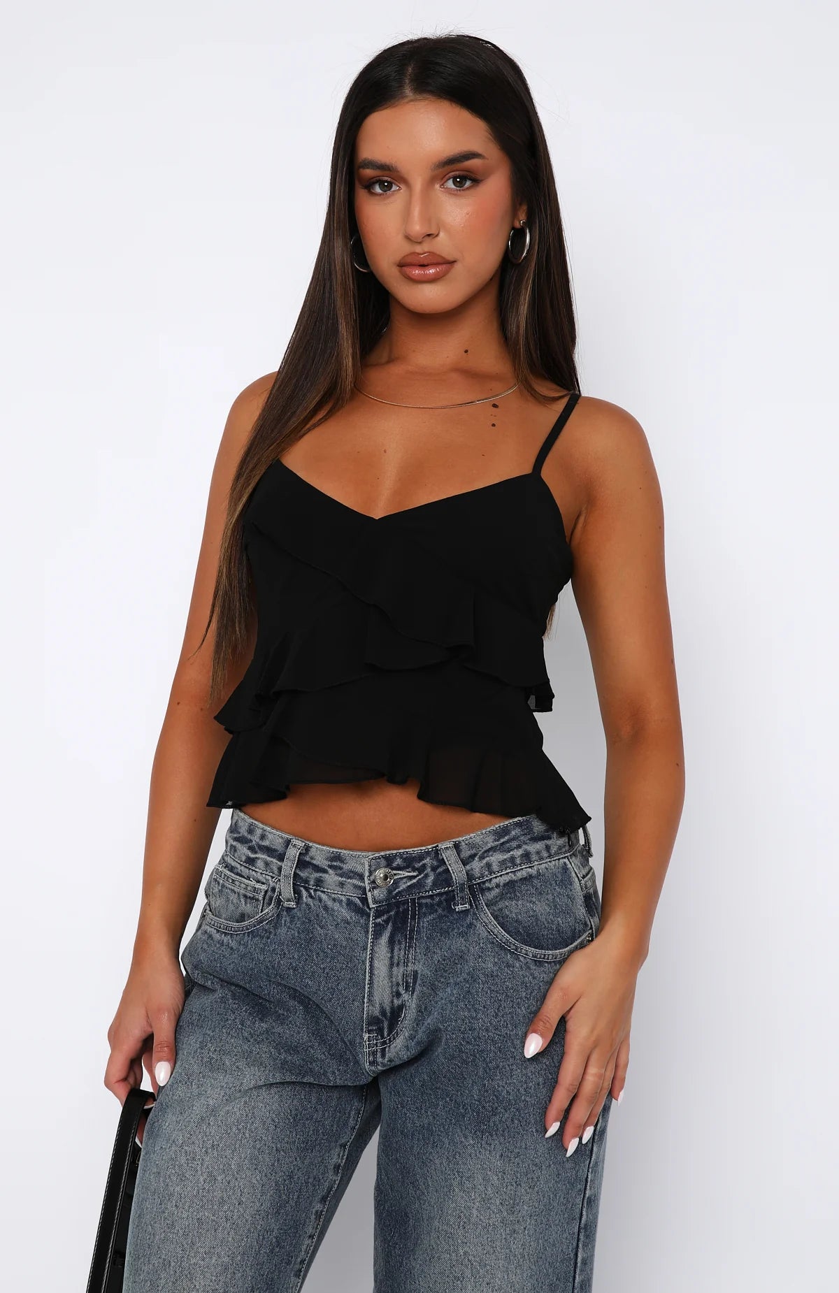 The Rules Of Love Top in Black is worthy of your next insta post! Features thin adjustable straps, low cut neckline, ruffled fabric design, lined fabric and cropped length. Complete the look with a mid rise jean for an on trend spring look!
