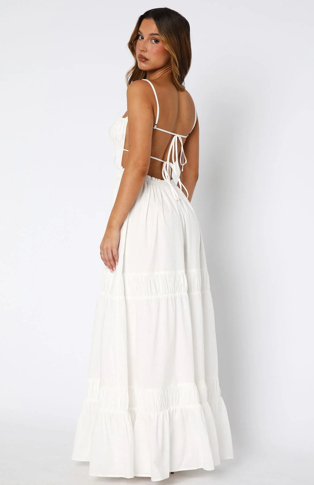 Introducing our sweetest new maxi! The Rumour Has It Maxi Dress in White features thin adjustable straps, square neckline with drawstring ties creating a ruched bust, additional drawstring ties under bust closing centre back, elasticated ruffle detailing on waist for a cinched look, ruched fabrication paneling down skirt and backless. Made for strolling through markets the maxi pairs perfectly with sandals and statement earrings.