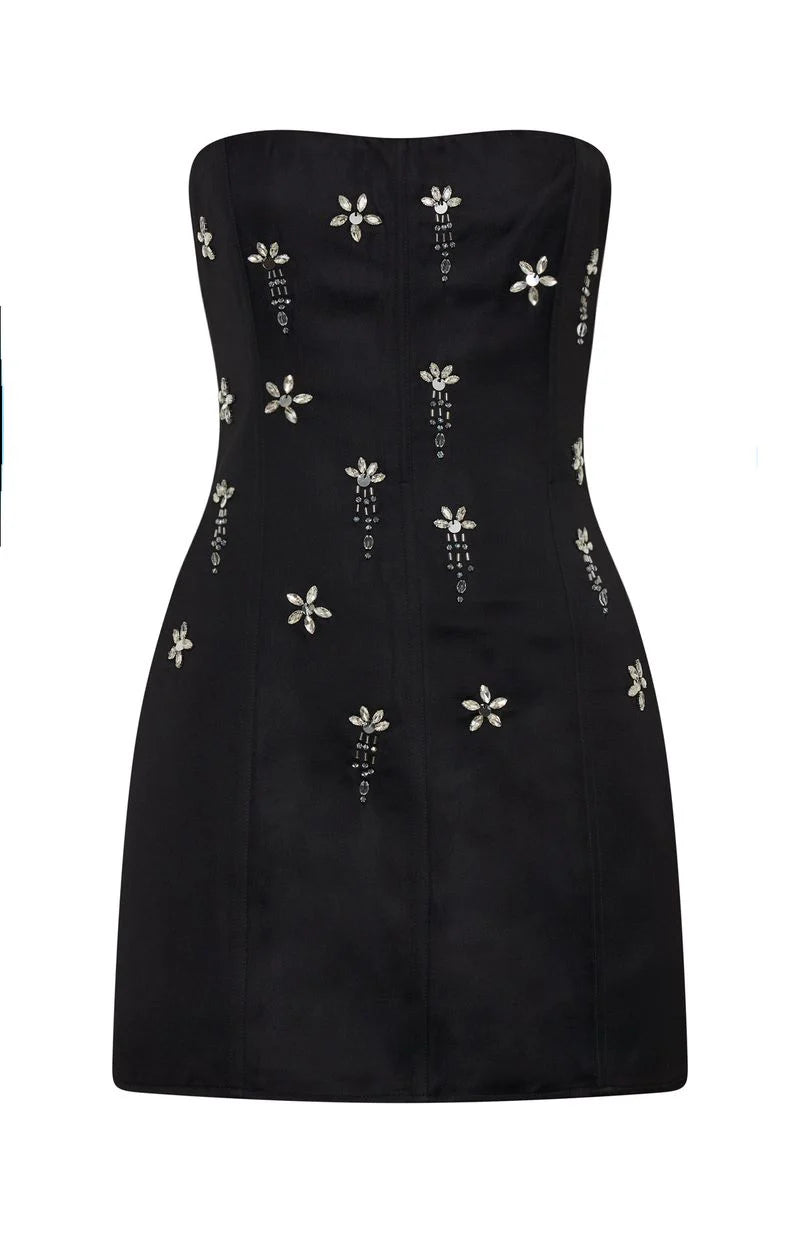 Out n about in the Savage Lust Strapless Mini Dress Black. Structured with internal boning, this strapless dress features grip tape at the neckline, shimmering beaded and rhinestone floral applique centre front, and a corset-inspired lace-up back. Silky fabrication and full lining ensure comfort, while an invisible side zipper plus hook-and-eye closure finishes the look. Style it simply with heels and minimal jewellery and let the dress take centre stage.