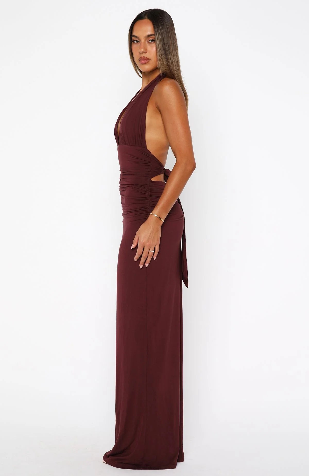 The perfect maxi dress doesn’t exist…Say hello to the Say What You Feel Halter Maxi Dress Burgundy. Features a halter neck design with back self tie strap, an ultra low plunge neckline, backless with self tie strap, maxi length, ruched detailing on sides, lined material and slight stretch material.