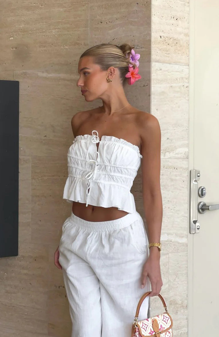 Designed to fit with ease, the Secret Society Strapless Top White will become your favourite. Featuring a strapless design, front bust ties, cropped fit, open midriff design and lined fabric. We love this paired with your go-to bikini and flats for a day in the sun!