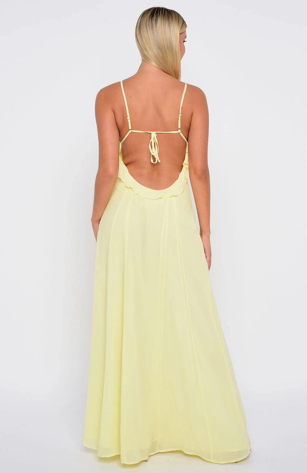 Embrace the allure of summer nights with the Self Sabotage Maxi Dress in Lemon. This captivating piece features adjustable shoulder straps, a subtle V-neckline adorned with ruffle detailing, and a front bow tie that adds a playful touch. Its backless design with a tie strap enhances its sultry appeal, while the sun dress silhouette flatters your shape. Fully lined for comfort and an invisible back zipper with hook-and-eye closure ensure a seamless fit. Pair with simple sandals and layered gold jewellery for a look we love.