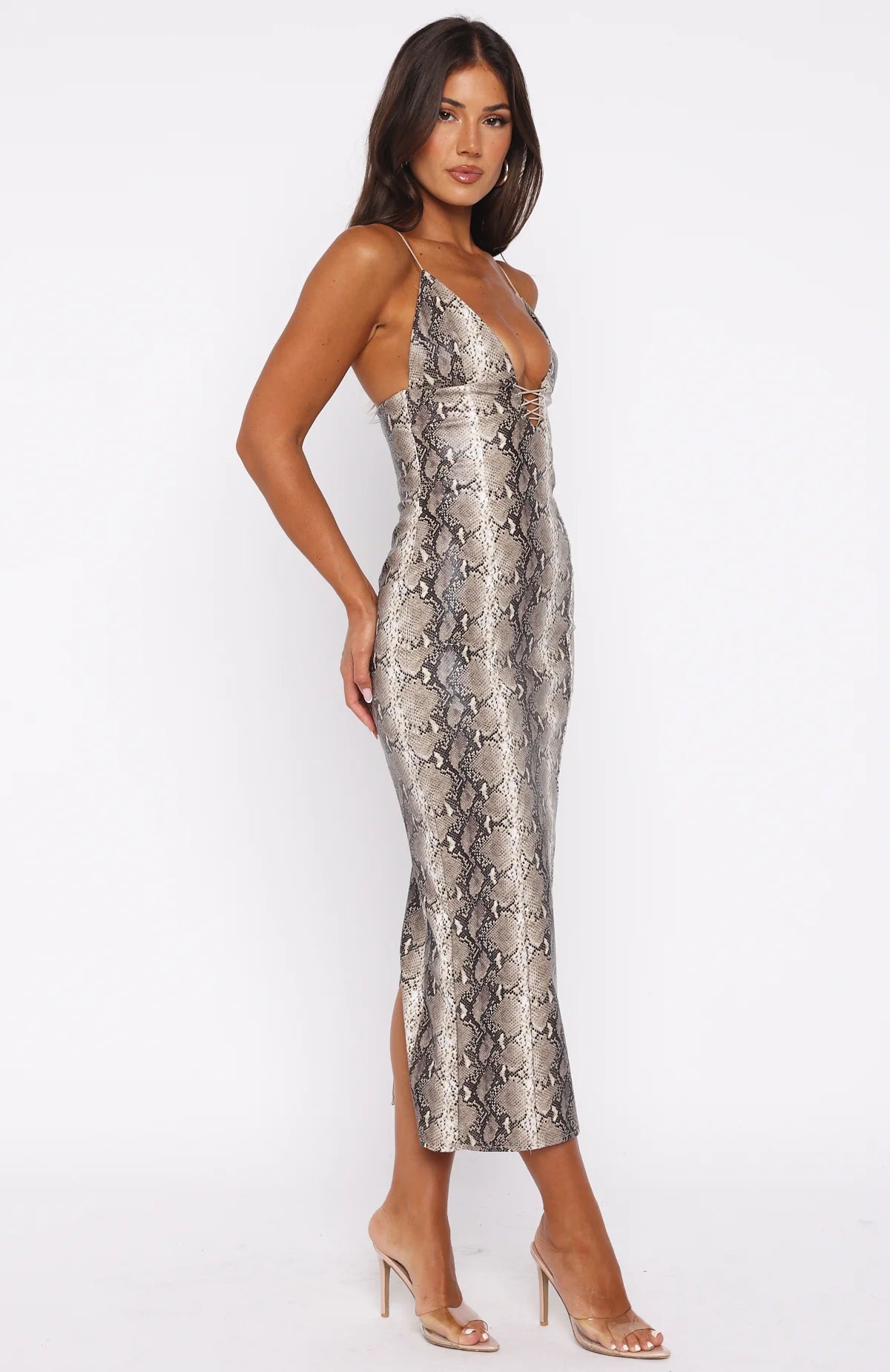 Make them look twice in the She’s A Queen PU Midi Dress in Tan Snake. Crafted from PU with a stunning snake-print, it features thin elastic straps and V-neckline and, crisscross tie at the center front adds a playful focal point. Finished off with a back leg split and invisible zipper for ease, plus full lining for a flawless fit. Style with clear heels and simple gold jewelry to let the dress do all the talking.