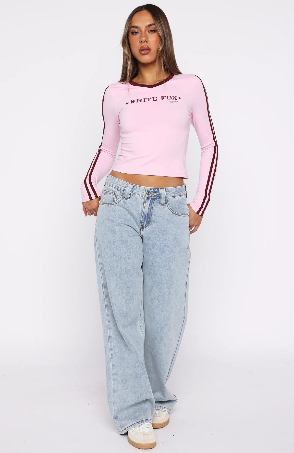Effortlessly cool and perfectly coordinated, the Star Of The Night Long Sleeve V-Neck Baby Tee in Pink features a subtle V-neckline, long sleeves with double stripe detailing, and a fitted silhouette. The printed White Fox text at the centre front adds a touch of signature style, and the unlined high-stretch fabrication ensures comfort. Style with the matching Star Of The Night Track Pants Pink.