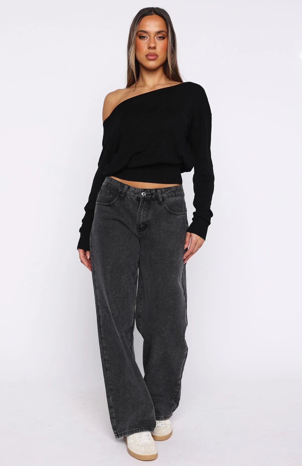 Elevate your style with the Stayed Down Off Shoulder Long Sleeve Top in Black. This chic piece features a flattering off-the-shoulder neckline, long sleeves with ribbed cuffs, and a ribbed waist that accentuates your silhouette. Its unlined design offers a lightweight feel. Style with denim jeans and layered gold jewellery for the cutest cosy weekend fit.
