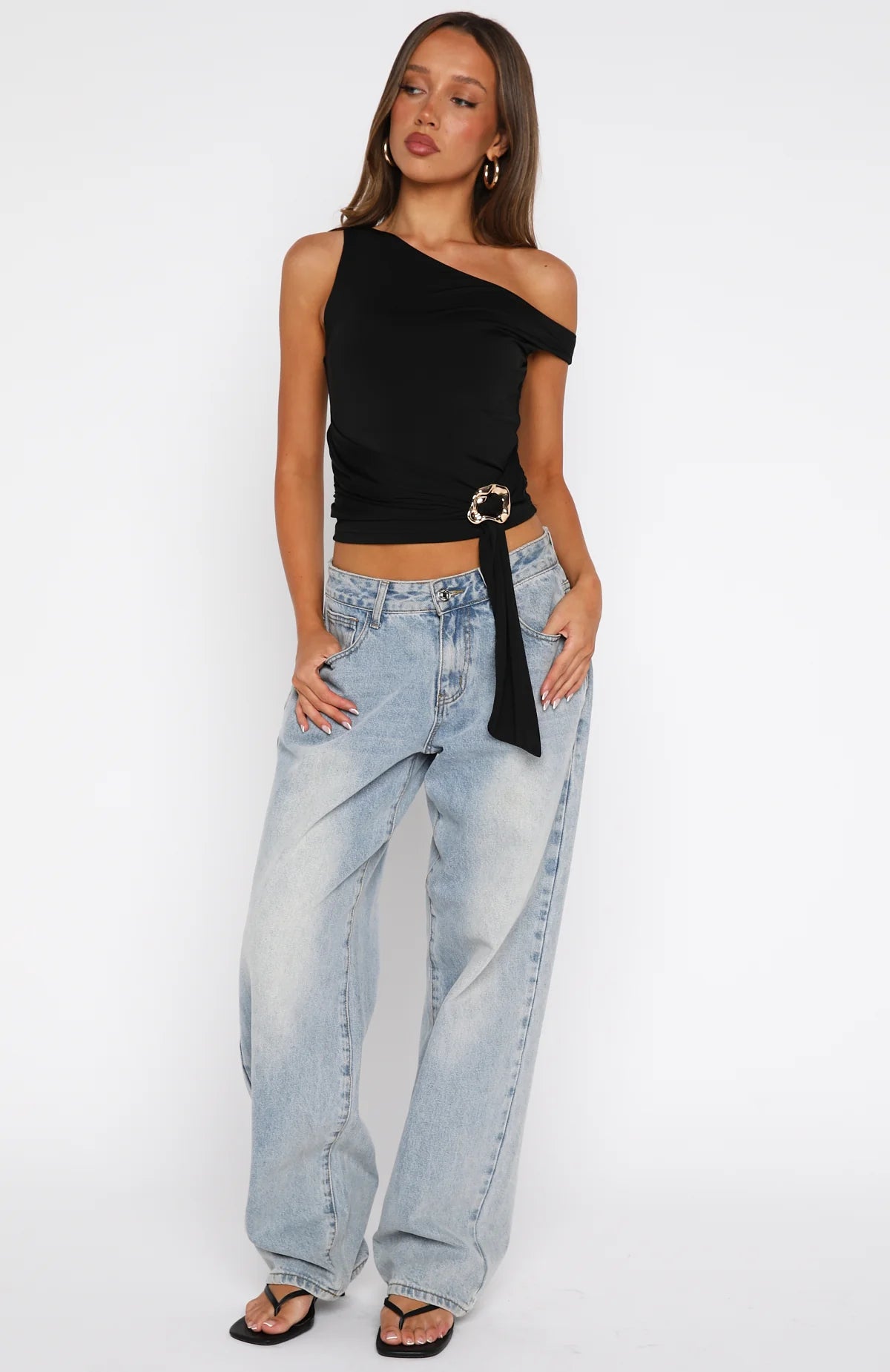 Your new Stuck In A Dream Off Shoulder Top in Black is waiting for you! Features an off-the-shoulder neckline, a sleek bodice, and a draped sash at the waist adorned with gold hardware detailing. Crafted from high-stretch fabric and fully lined, it offers both comfort and a flattering silhouette. Style with tailored pants, kitten heels and layered gold jewellery for a chic fit.