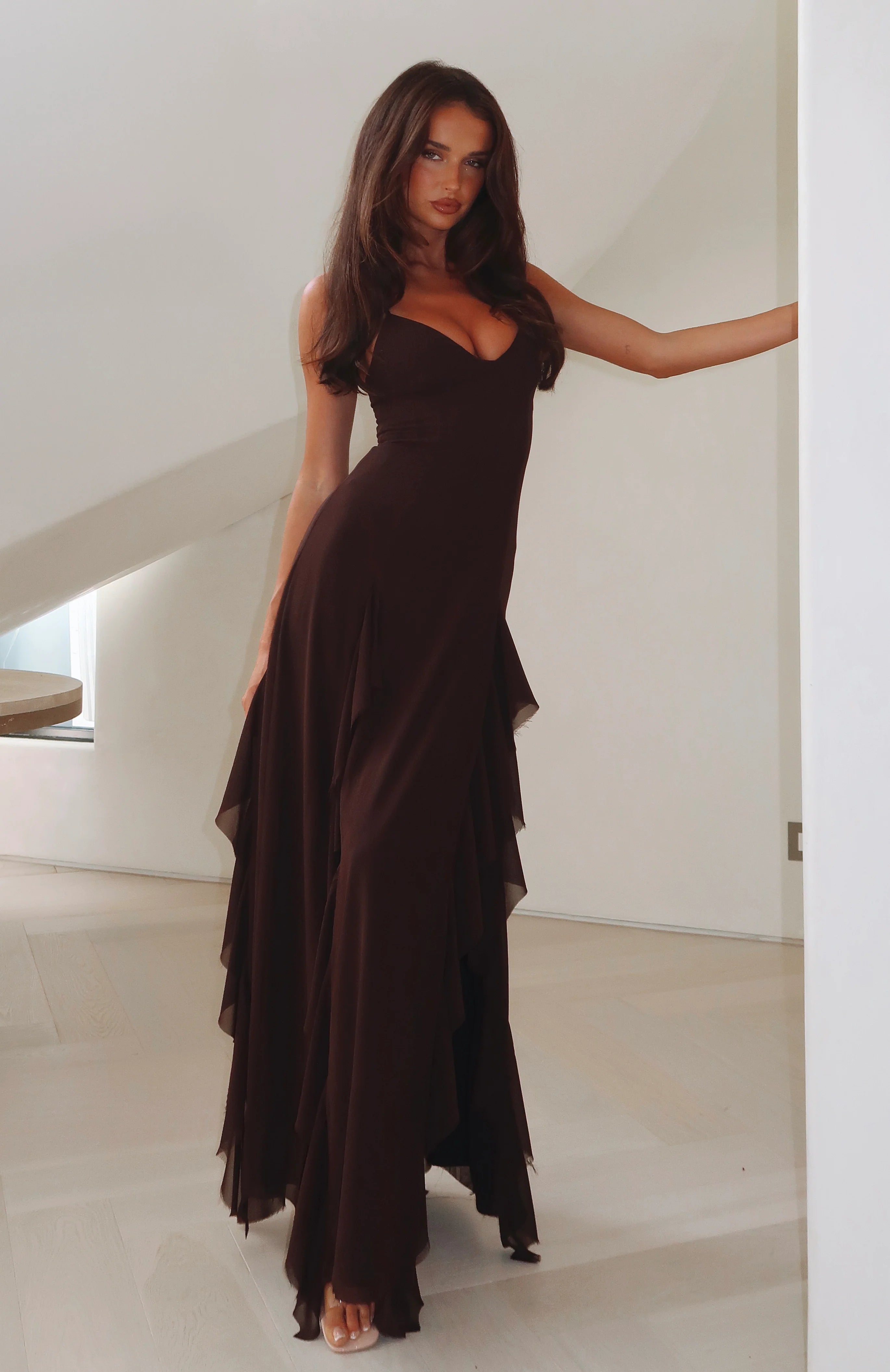 The Summer Solstice Maxi Dress Chocolate is perfect for those long, sunny days and warm nights spent celebrating. Features thin, adjustable shoulder straps, low plunge V-neckline, high side split design, frill detailing, maxi length, raw hemline which naturally frays and invisible zipper and clasp closure.