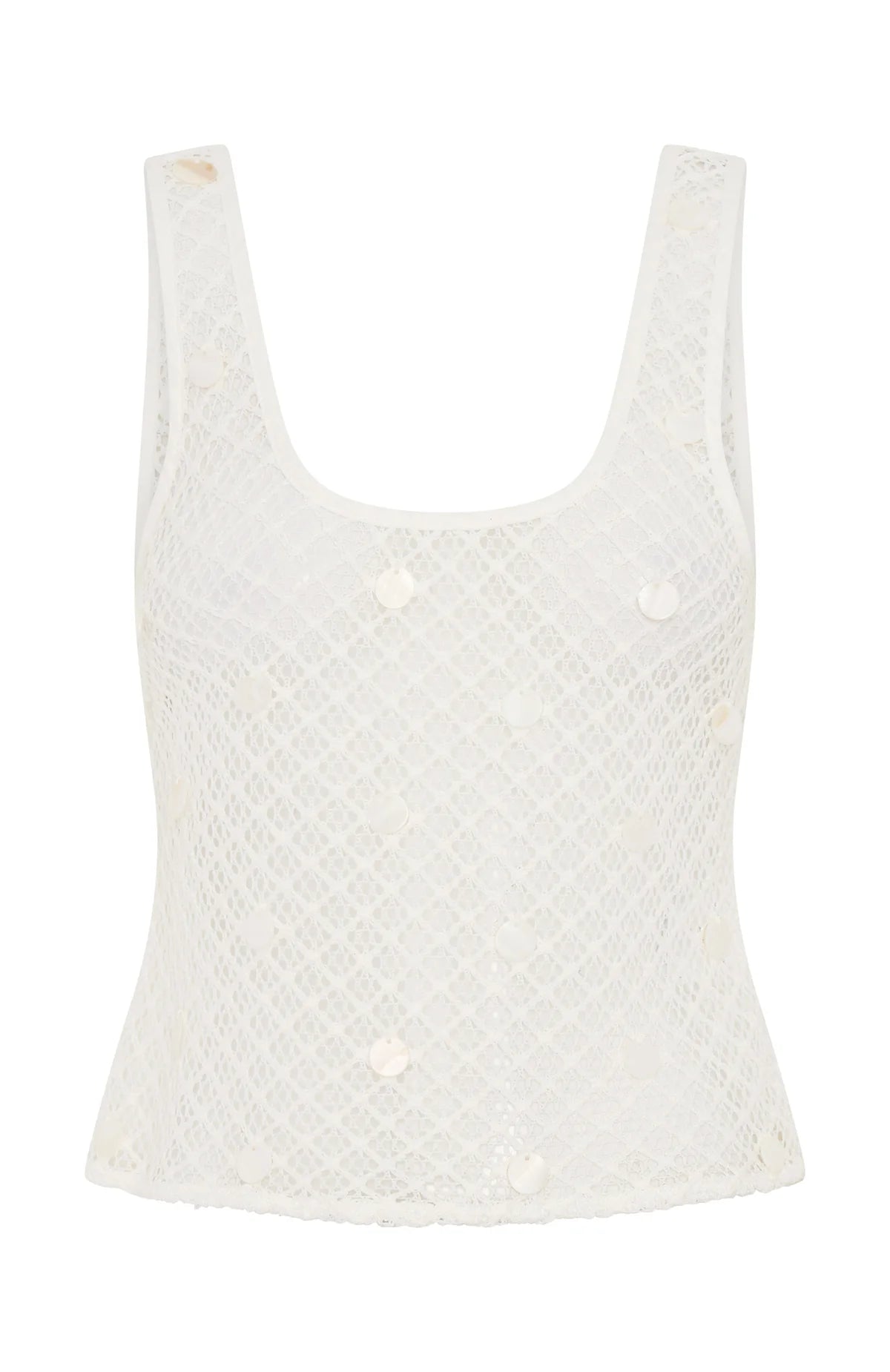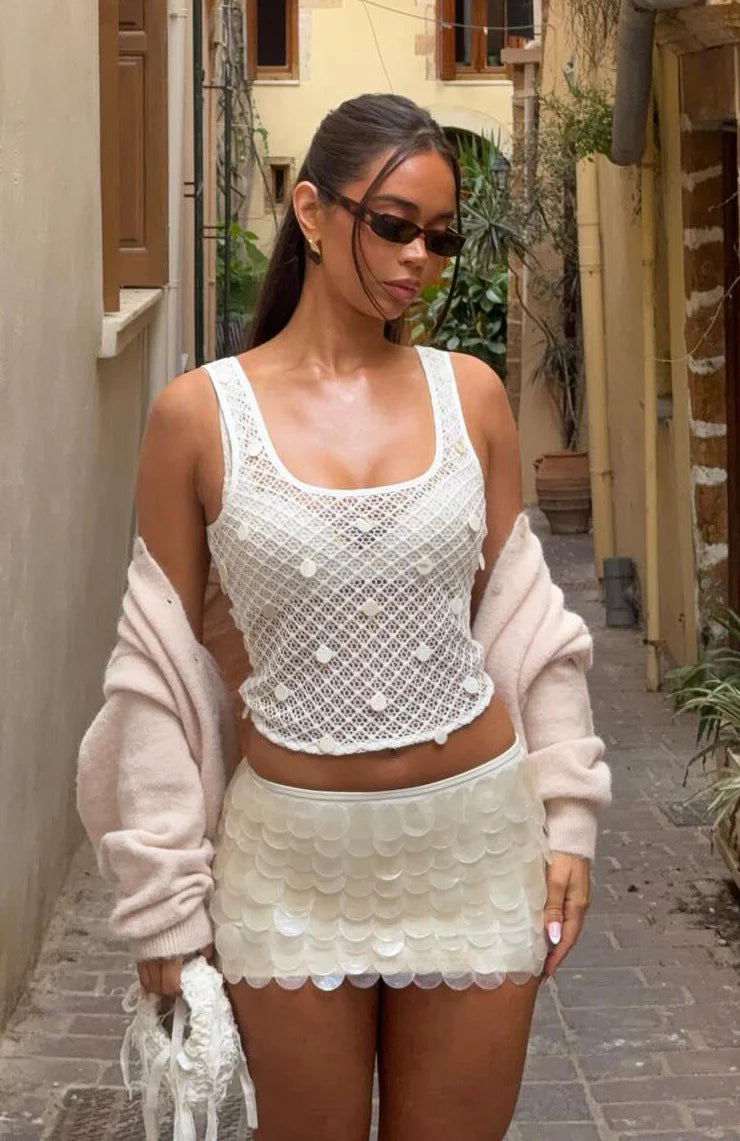 Embrace the sunshine in the Sun Seeker Crochet Top in White! Features thick shoulder straps, scoop neckline and sheer fabrication with shell detailing. Finish the look off with the Forgiven Aura Shell Mini Skirt, strapless bikini top and layered jewellery for a look we love!