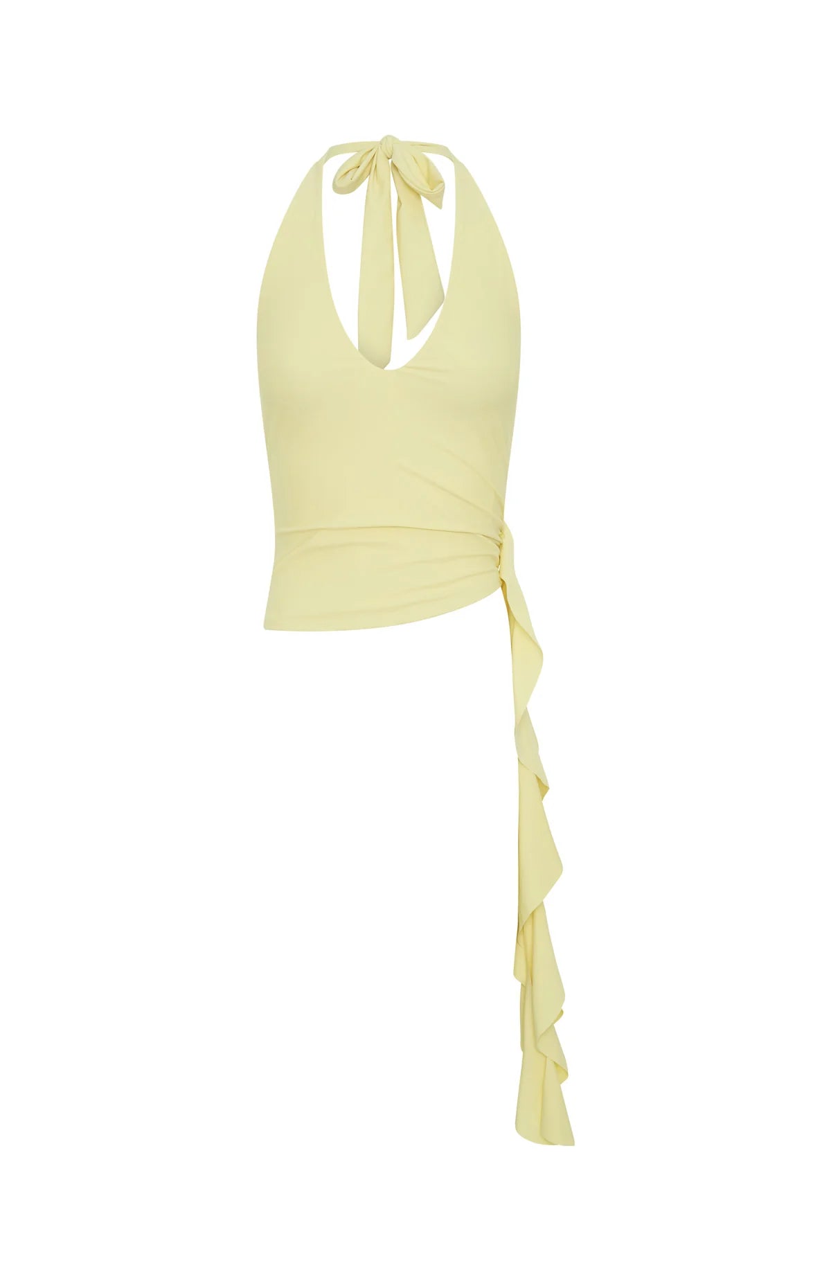 Enjoy the sun on your skin in the Sunset Soiree Halter Top in Lemon! Features thick self tie straps, plunge neckline, attached ruffle sash on side, backless and lined. Pair with the Our Love Maxi Skirt Lemon Blossom for a stunning dinner fit!