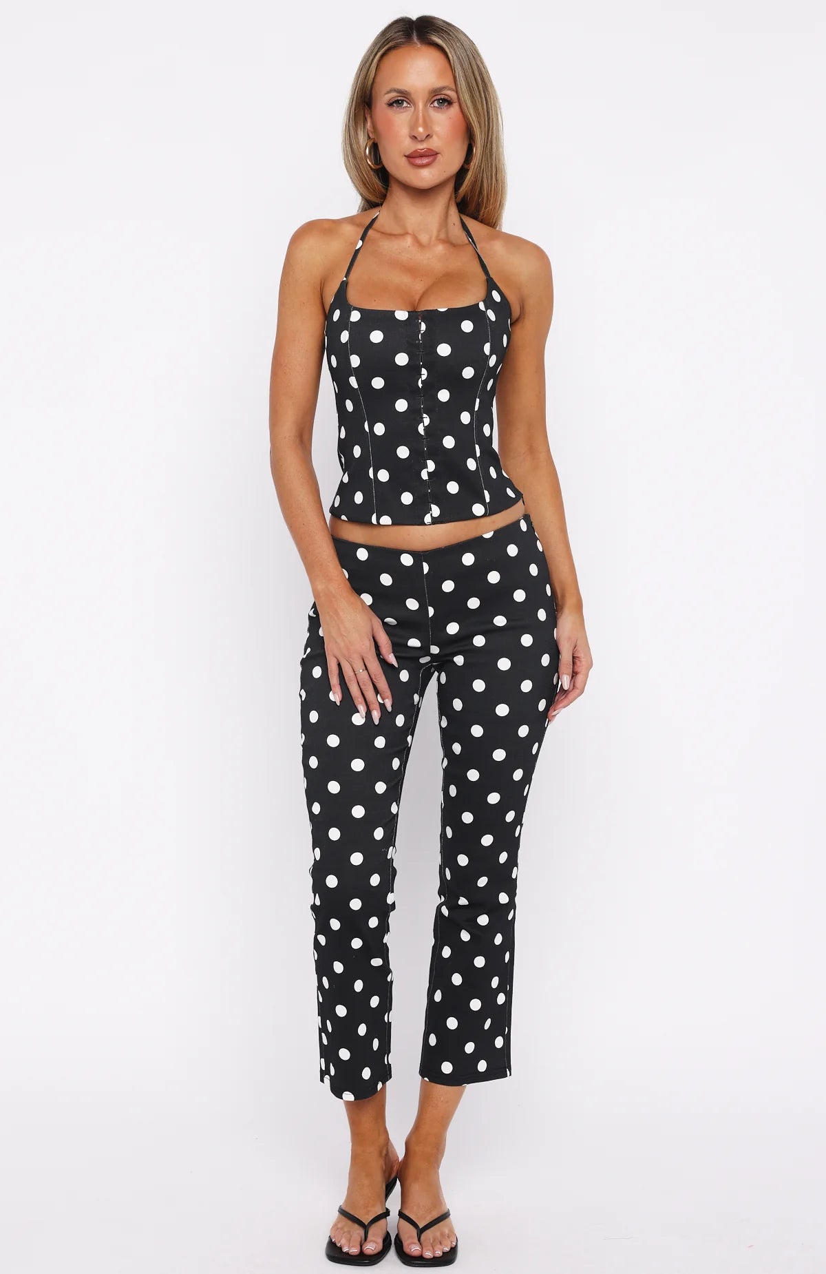 The Sweetie Darling Bustier in Black/White Polka Dot fuses sculptural structure with feminine charm. Thin self-tie halter straps lead to a scoop neckline and open back, while internal boning create a contoured, flattering shape. Finished with a central hook-and-eye fixed closure down centre front, invisible side zipper and mesh lining. Style with the matching Sweetie Darling Capri Pants and kitten heels for a chic brunch look.