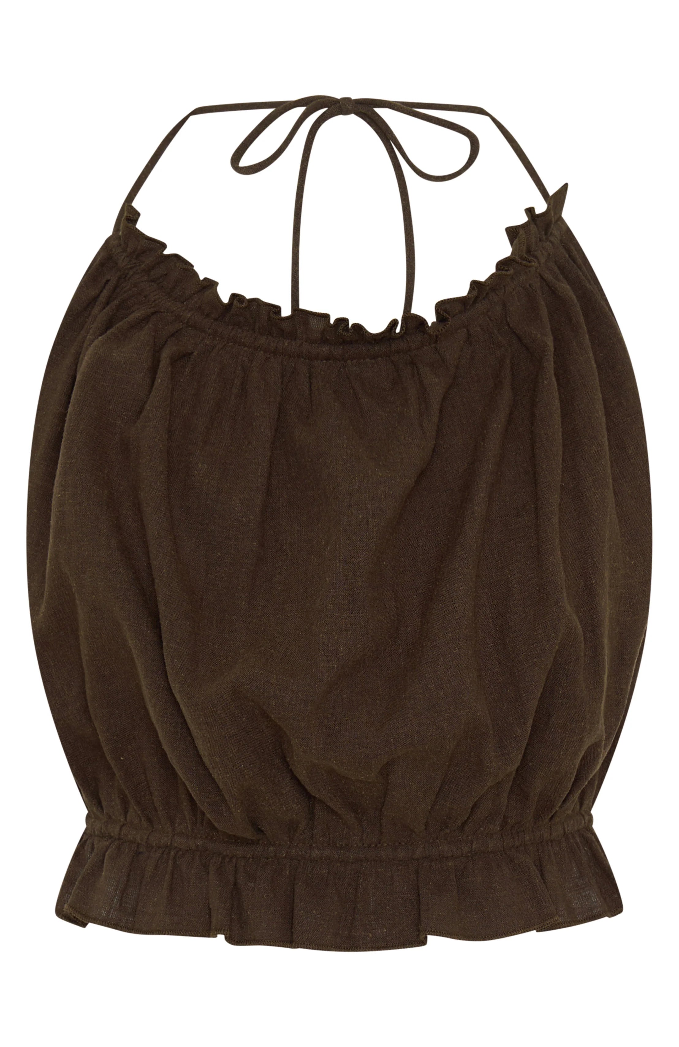 Statement separates that are even dreamier paired together. The Take Me Away Top in Chocolate features halter neckline with drawstring, ruffle detailing, drawstring straps on back to give support and backless. Complete the look with the matching Take Me Away Pant in Chocolate.
