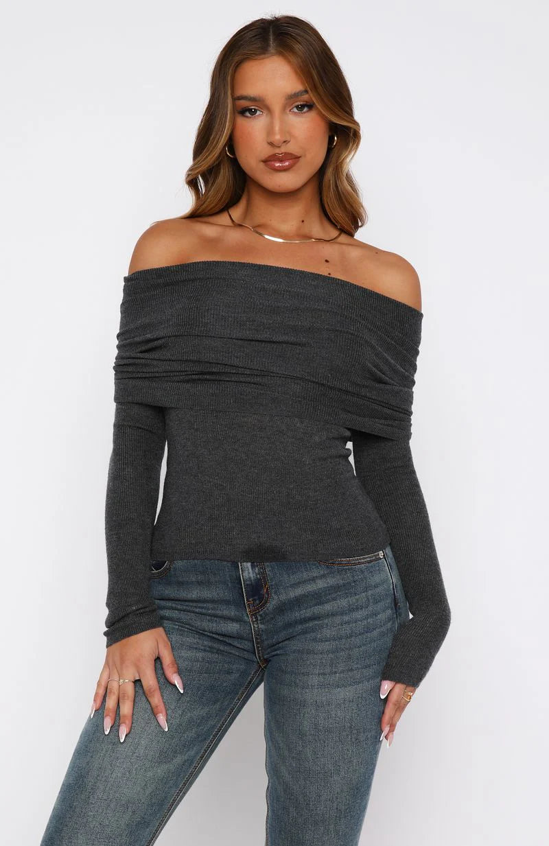 Keep it off the shoulder in the Take The Reigns Long Sleeve Top Charcoal. Features an off the shoulder design, wide fold over hem, long sleeves, semi-sheer, unlined, knitted fabric with high stretch for an easy slip on design and comfortable fit. Pair with a mid rise jean and kitten heels for a look we love.