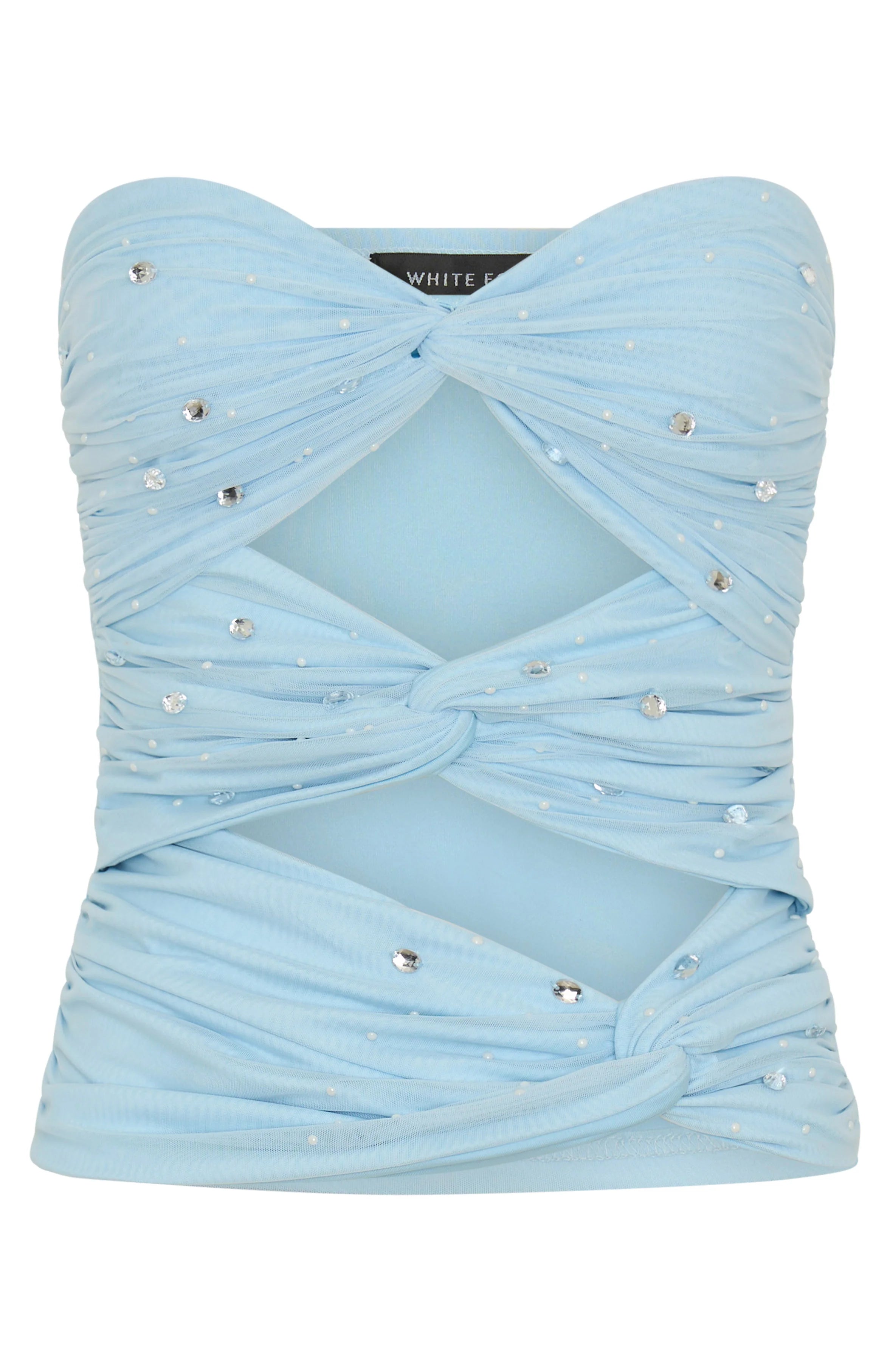 The Taking What's Mine Strapless Top in Blue all about the details. Features strapless neckline, grip tape, ruched knotted fabrication centre front with cut outs and stunning pearl and crystal detailing.