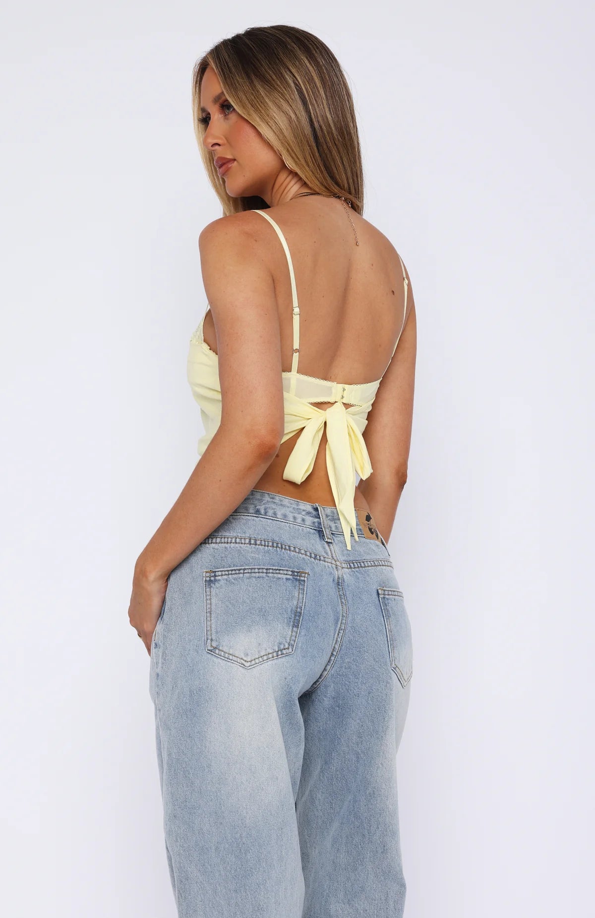 Add a subtle touch of luxe to your outfit in the Tell Me All About It Top Lemon. Features a sewn in lace bra with thin adjustable straps and adjustable back closure, lightweight linen fabric, tie-up back detail and layered bra effect. Looks best paired with a low rise jean and mini bag for a dainty look!
