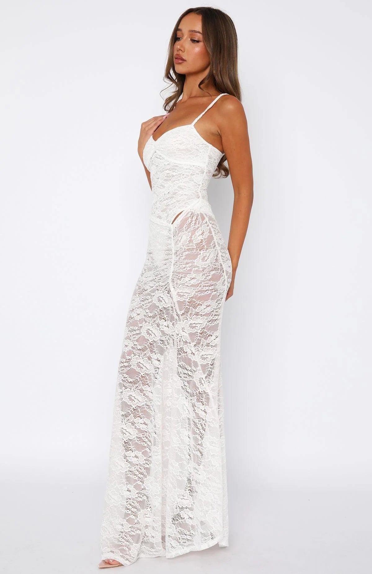 Turn heads in the Tell Me I'm Pretty Lace Maxi Dress in White! Featuring thin, adjustable shoulder straps, a sculpted sweetheart neckline with ruched detailing that highlights the bust, a built-in bodysuit with snap-button crotch closure, lined at bust for full coverage, ruched detailing at waist and sheer lace overlay material on bodice and skirt for an effortlessly romantic finish. Pair with simple heels and layered gold jewellery to receive all the compliments.