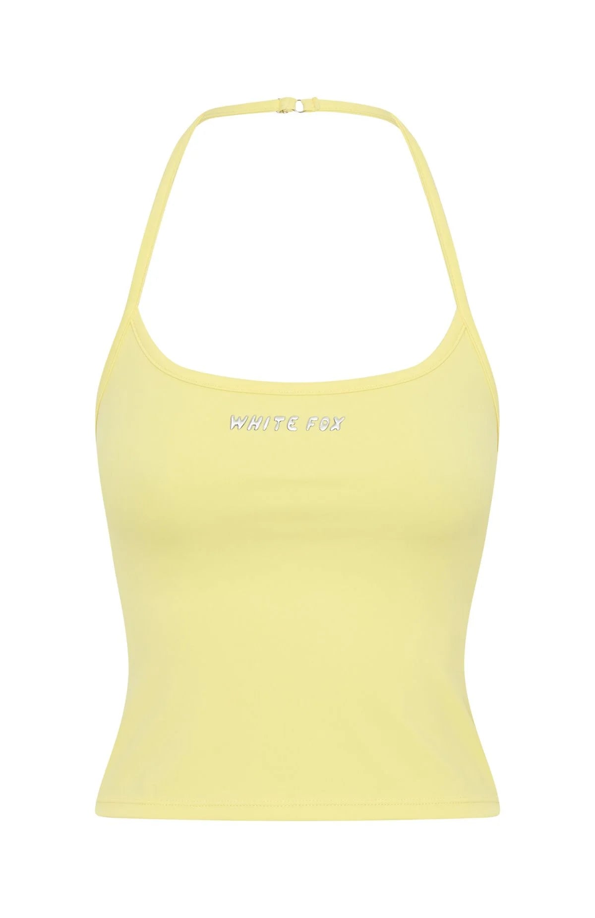 Lounge lovers are obsessed with the Test Drive Halter Top Lemon. Designed with fixed adjustable halter straps, a scoop neckline and a fitted bodice crafted in high-stretch fabrication, this sleek piece showcases a puff-print metallic White Fox text across the centre front. Style with the matching Test Drive Lounge Shorts for a cozy yet cool fit.