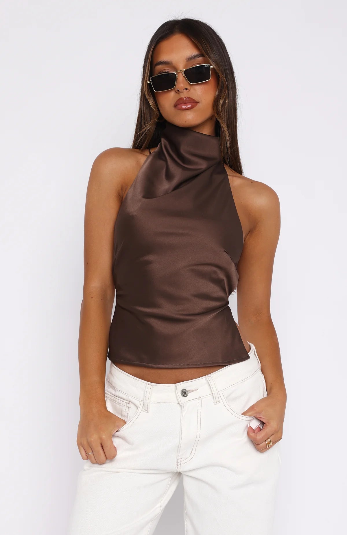 The Time Passes Halter Top Chocolate is dance-floor approved. Features a cowl neck, halter style design with button closure at back, backless design with adjustable back ties, fully lined, and high shine, silky fabric. Pair with your go-to jeans, gold accessories and perspex heel for a stunning look!