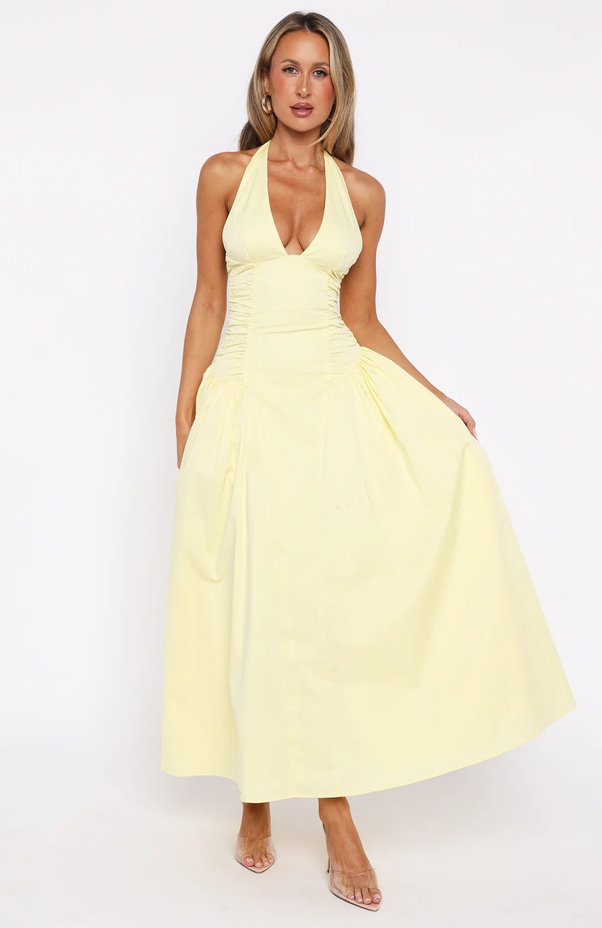 Be mistletoe‑ready with a splash of sophistication in the Tinsel Trouble Halter Midi Dress Lemon. It's thick halter straps frame the collarbone while the plunging V‑neckline draws the eye, the fitted bodice leads into a voluminous skirt with a straight front panel. Finished with a corset‑inspired lace‑up back with back zipper and hook‑and‑eye closure. Style with kitten heels and bag to shine all holiday long.