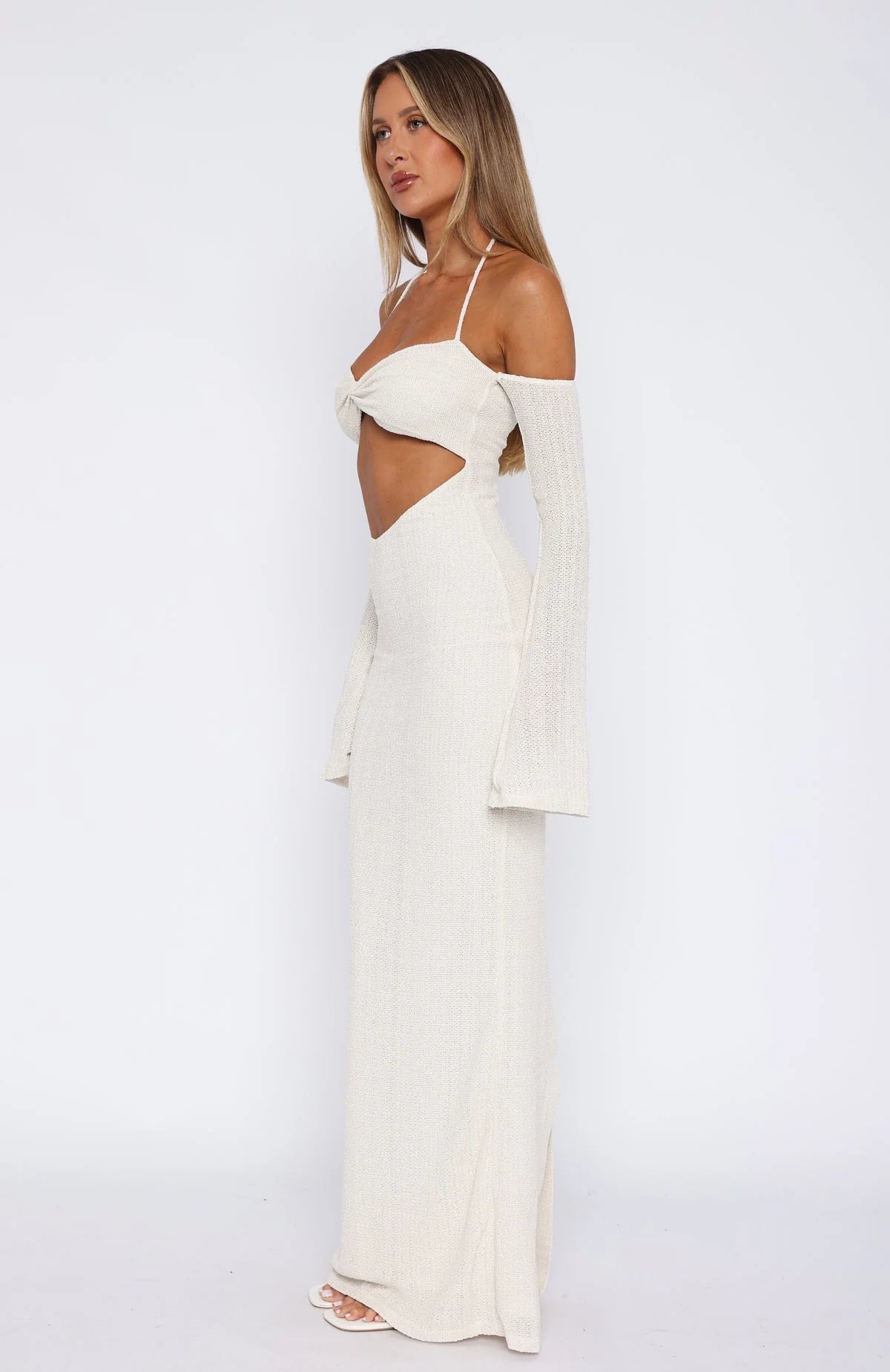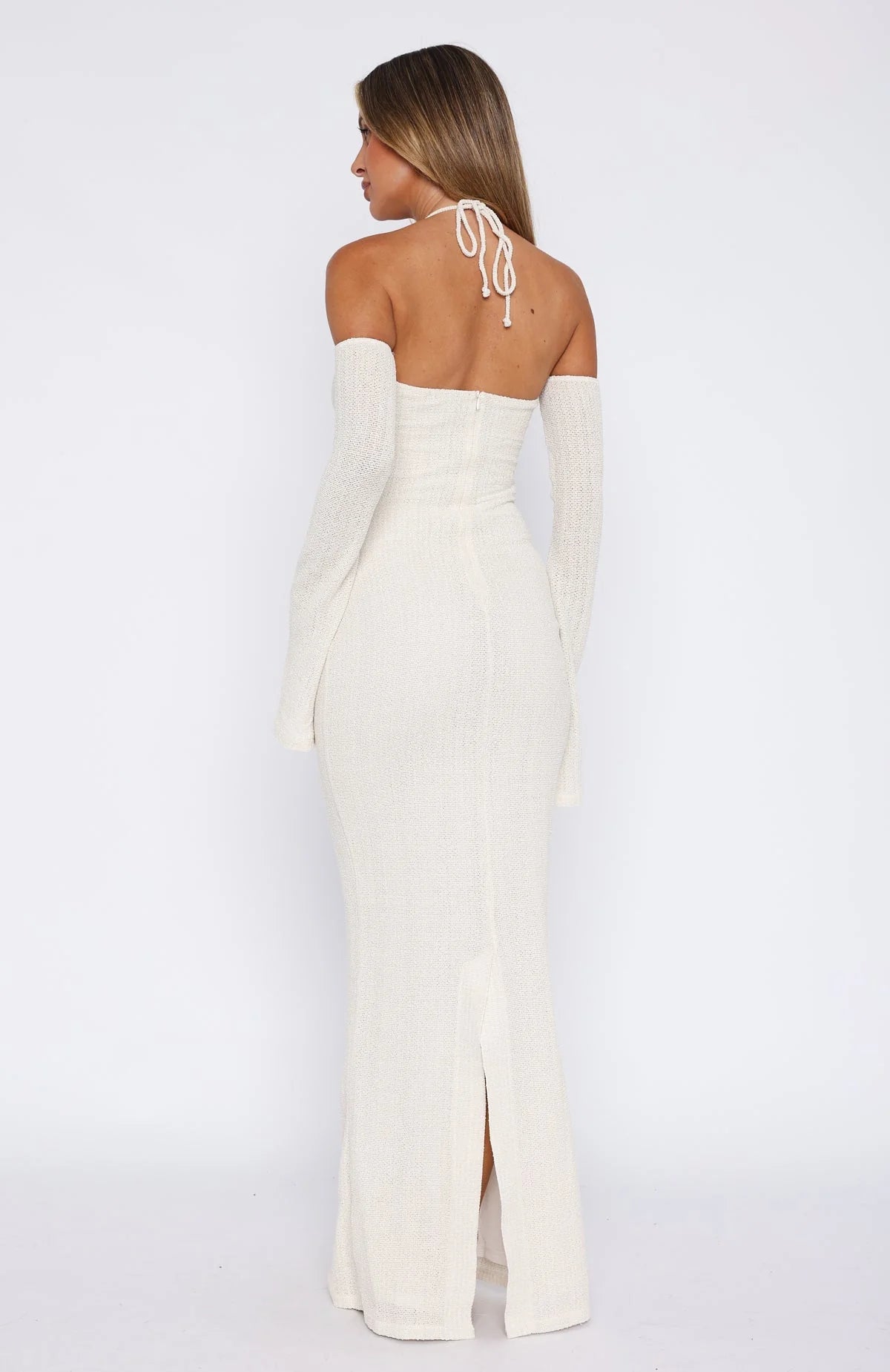 Introducing the cutest resort dress you'll ever see! The To The Beach Long Sleeve Maxi Dress Cream features a halter style neckline with self-tie straps, plunge neckline, attached long sleeve design with a slight flare, lined fabric, front cut-out design, hidden centre back zipper with hook & eye, maxi length and back split hemline.