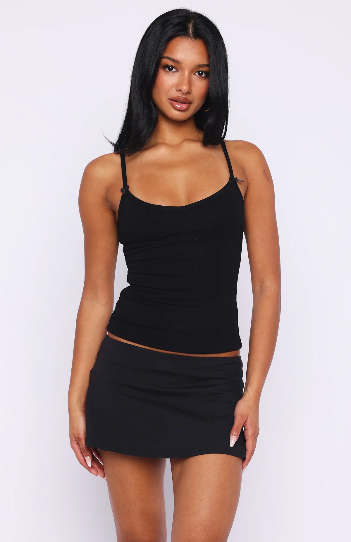 The Too Cute To Care Cami Top Black is serving us all the flirty and fun vibes! Featuring thin shoulder straps, small bow embellishment at straps, scoop neckline, semi-cropped length, stretch material for an easy slip on design and gorgeous printed fabric.