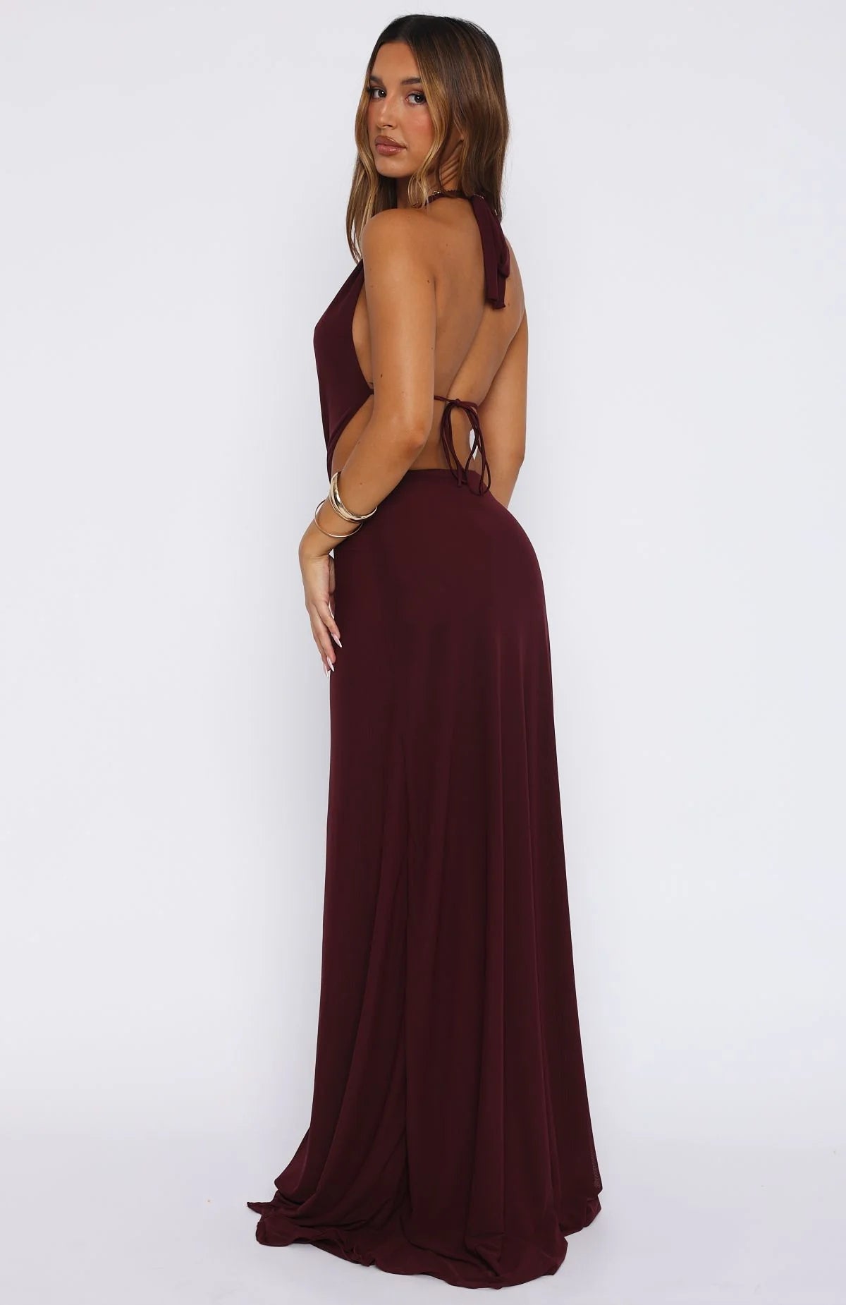 For our girls who don’t just do summer, they own it. The Tuscany Twilight Maxi Dress Plum features a halter style design with back self tie closure, an ultra low plunge neckline, cut out detailing, backless with self tie closure, centre front split detailing, slight stretch material and maxi length. Complete the look with sandals and layered jewellery for the perfect dinner fit!