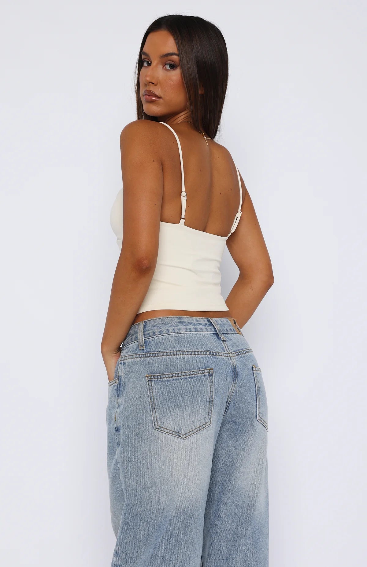 The Used To Be Young Top Off White features thin adjustable straps, low cut neckline, front cut-out design, gold detail for a cinched feature at bust, slip on style and lined, soft fabric. Looks best paired with a mid-rise jean and platform flats for a chic summer vibe!