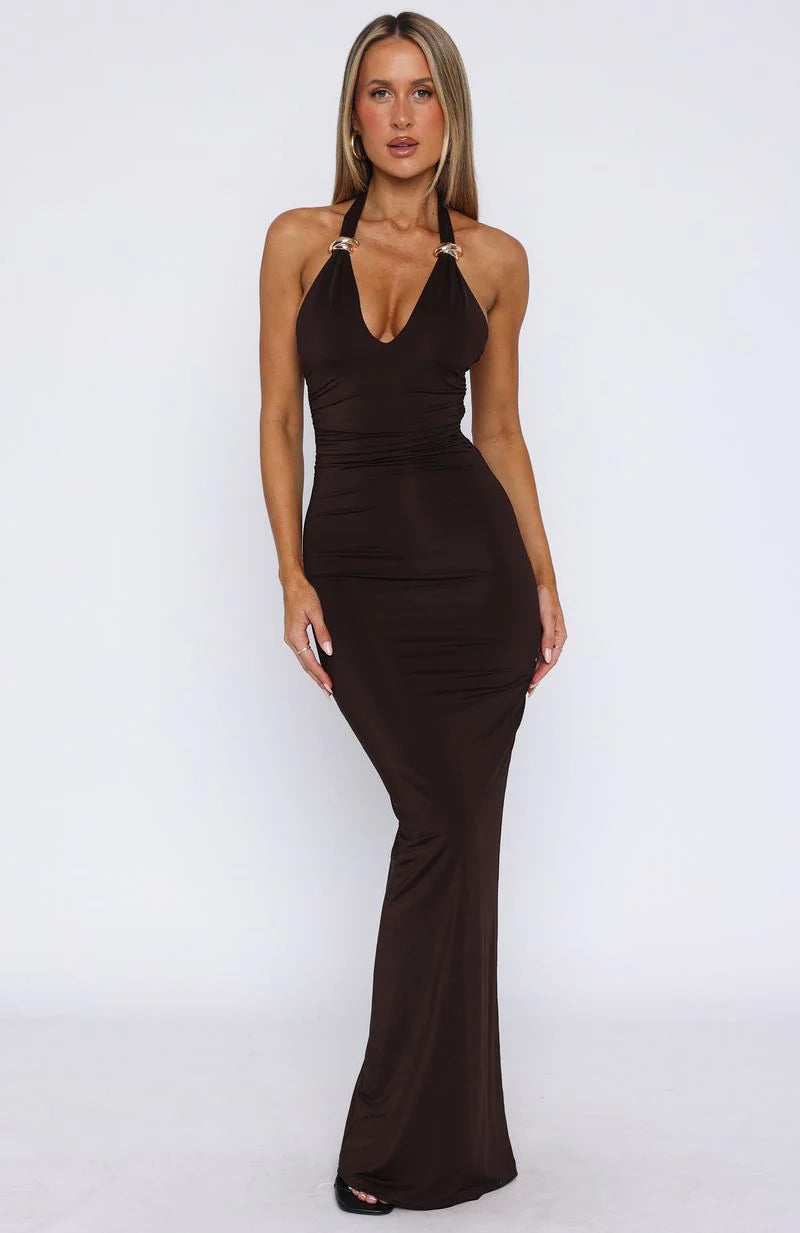 Step into the spotlight in the Waste A Moment Halter Maxi Dress in Chocolate! features self tie halter straps with gold hardware detailing, v-neckline, backless, ruched detailing lower back, lined and back leg split for ease of walkability. Pair with clear heels, layered gold jewellery and a shoulder bag for a fit we love!