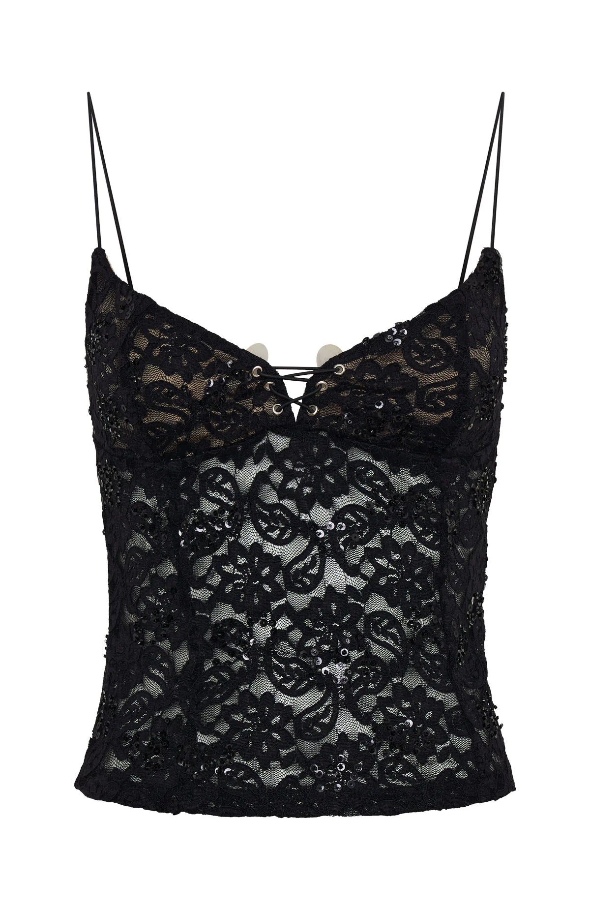The Weekend Escape Lace Top in Black blends sculptural lines with soft femininity. Features fine elastic straps for comfort, a flattering V‑neckline with criss‑cross detailing, chic beaded lace fabrication that catches the light, full lining for smooth wear, and high‑stretch construction. Style with the matching Weekend Escape Lace Pants, kitten heels and a statement bag.