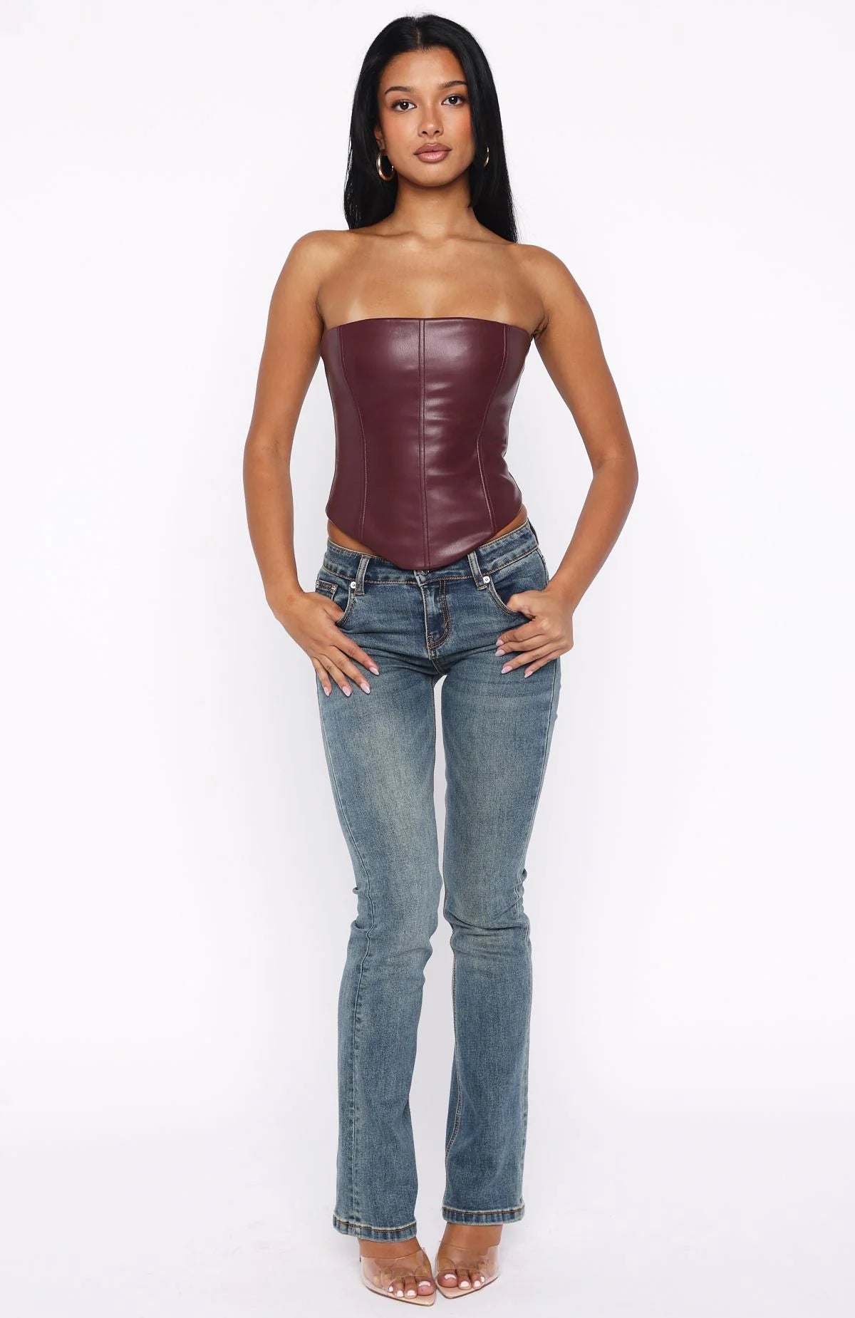 The Wipe My Mind Strapless Pu Bustier in Deep Plum is your invitation to stand out. Crafted from PU fabrication, this fully lined strapless bustier features a supportive grip tape neckline, internal boning for a sculpted fit, and a corset-inspired lace-up back. Style with your go-to denim jeans and kitten heels for an effortless look.